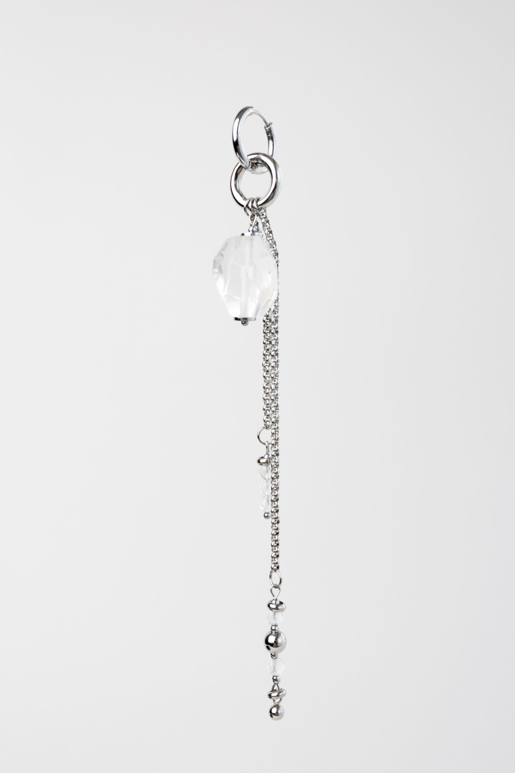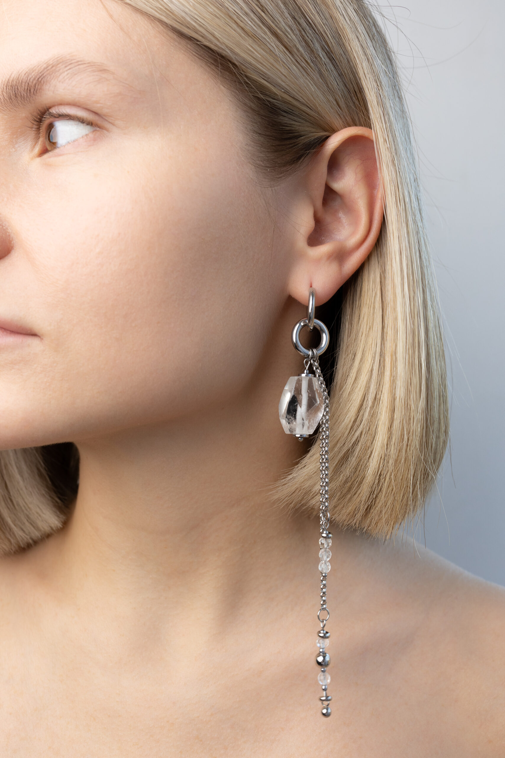 Delikatne kolczyki z naturalnym górskim kryształem, które podkreślą indywidualny styl i nadadzą lekkości każdej stylizacji. Dłuższy element z łańcuszkiem i drobnymi kamieniami przyciąga wzrok przy każdym ruchu — migocze w świetle, dodając całości tajemniczego uroku.