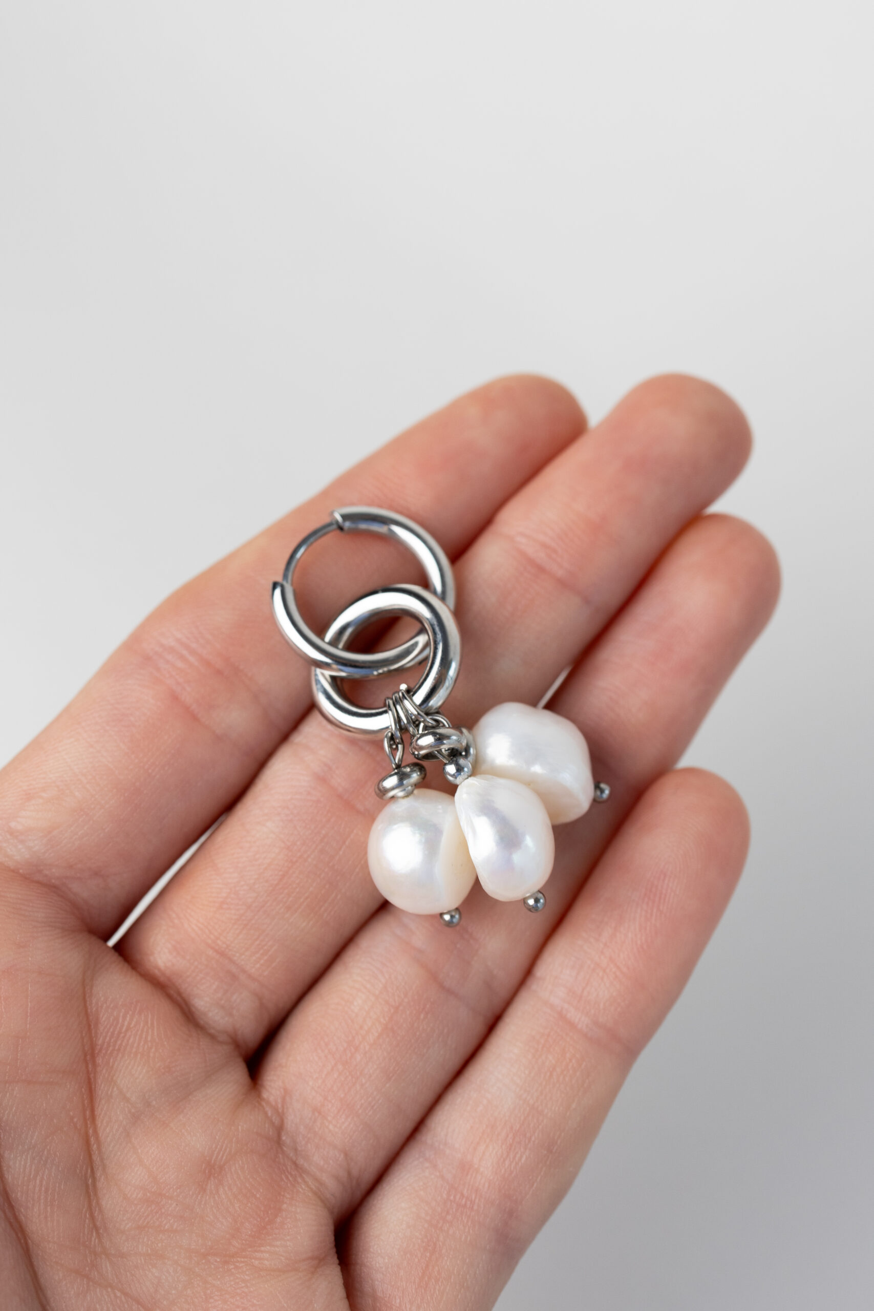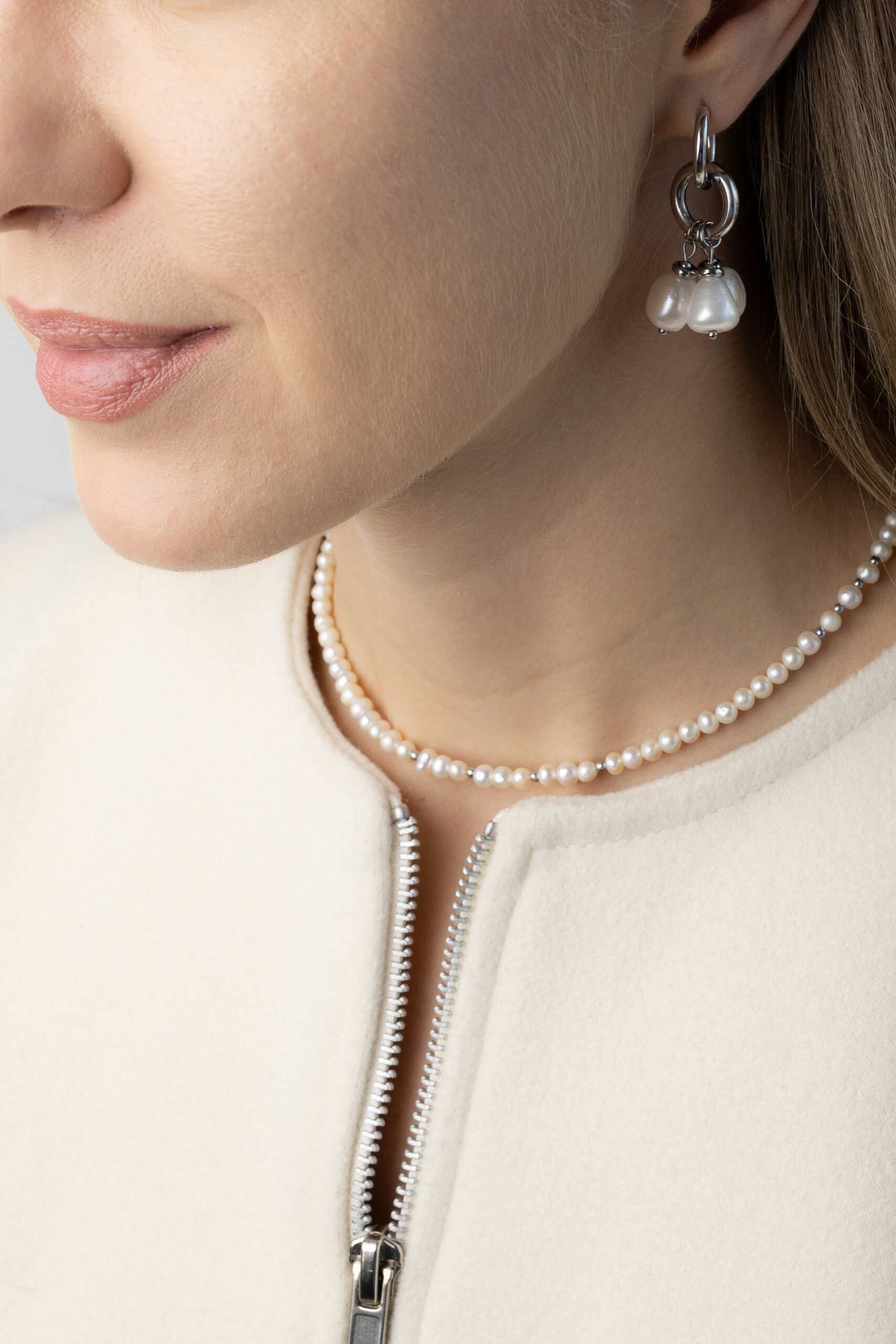 Subtelne, ale pełne charakteru kolczyki z naturalnymi perłami, które łączą klasykę z nowoczesnością. Miękki połysk pereł pięknie kontrastuje z chłodnym blaskiem stali, tworząc zmysłową równowagę między delikatnością a siłą.