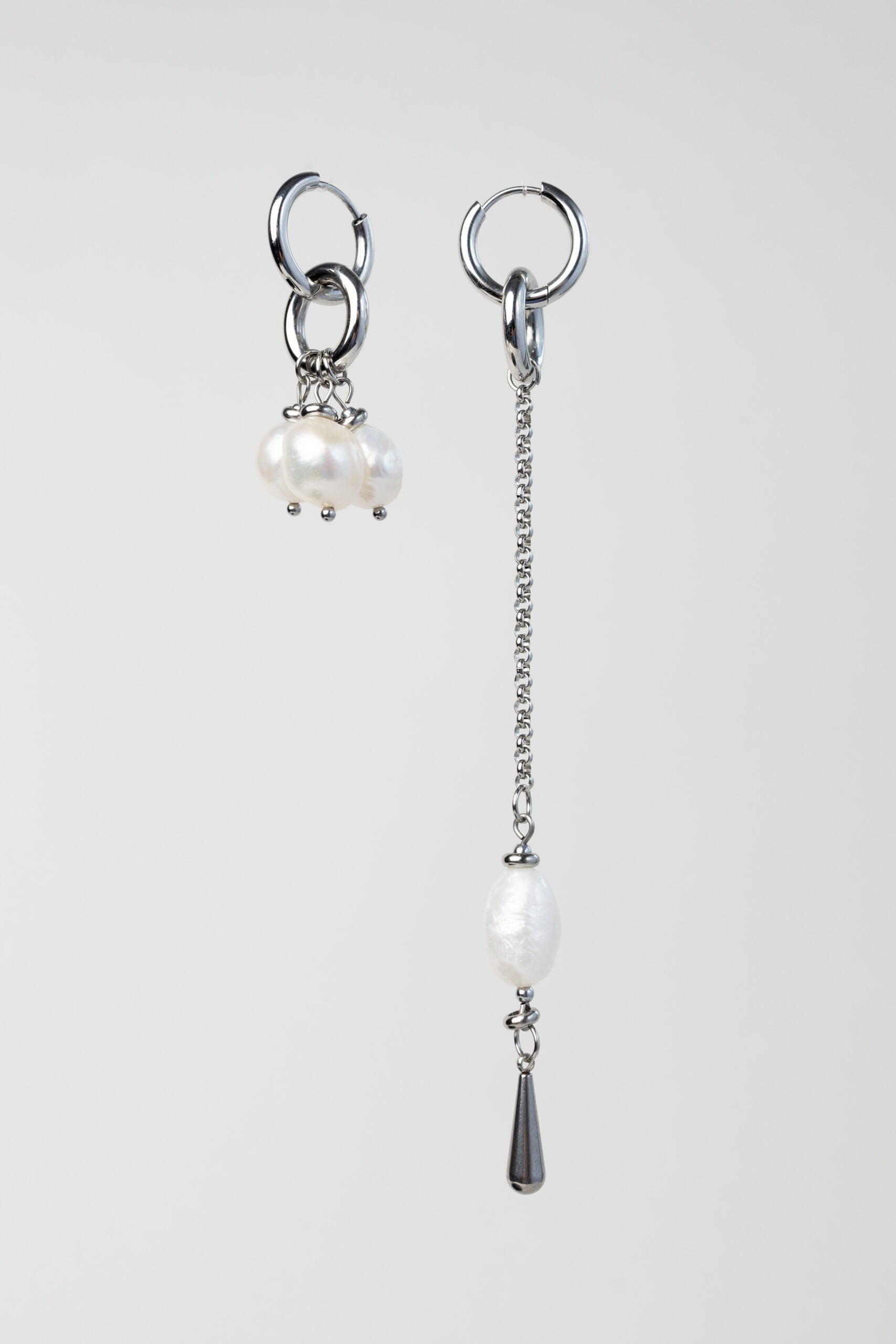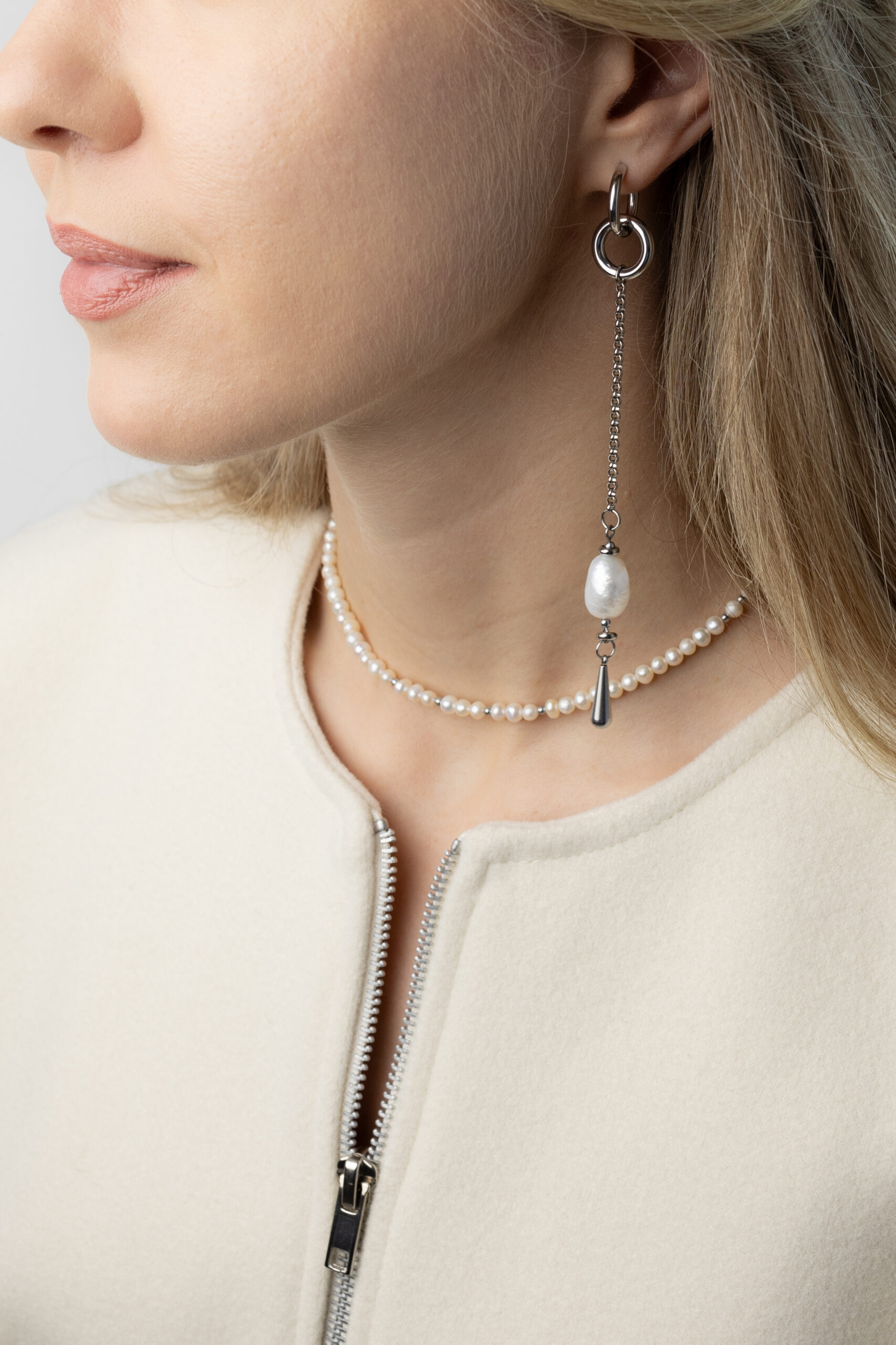 Asymetryczna forma i długi łańcuszek nadają całości lekkości i ruchu — każdy krok sprawia, że perły delikatnie tańczą w świetle. Kolczyki można nosić na różne sposoby: jako pełną parę, asymetryczny zestaw lub pojedynczą mono kolczyk.