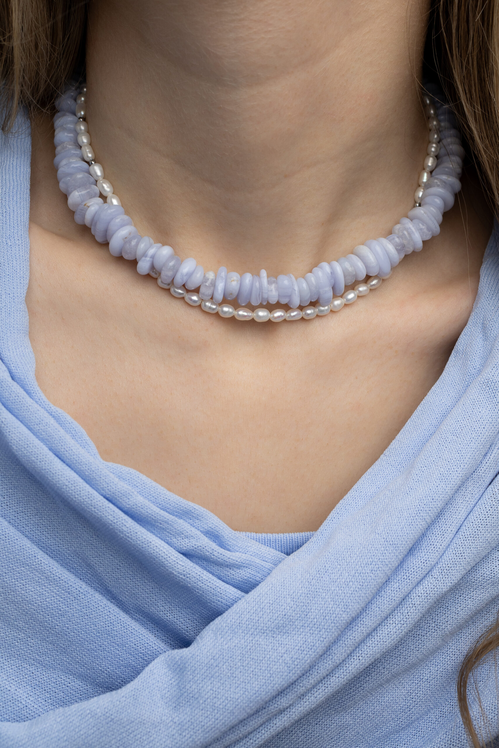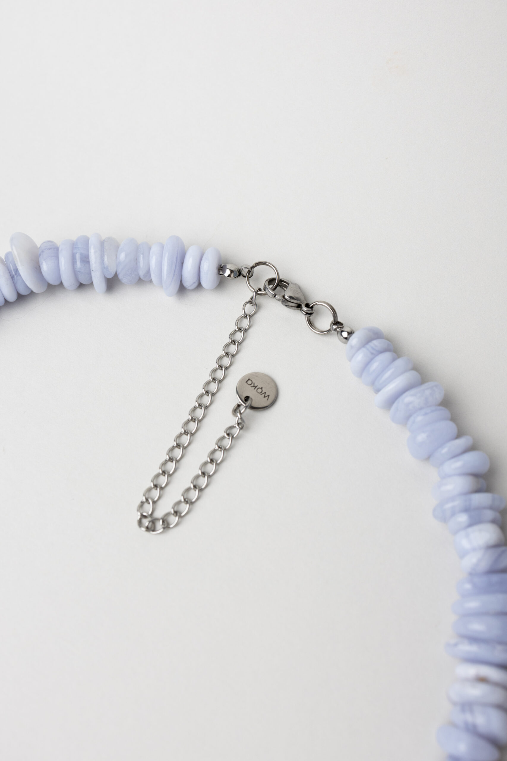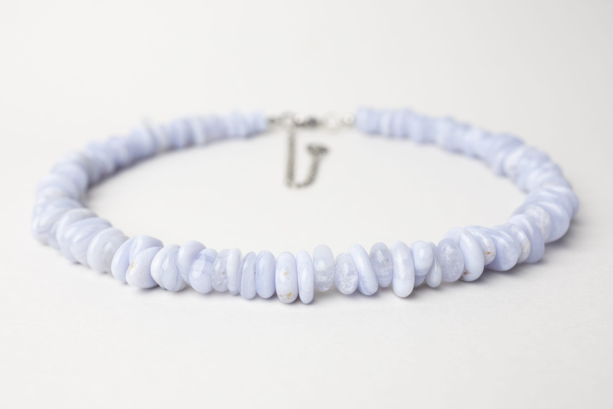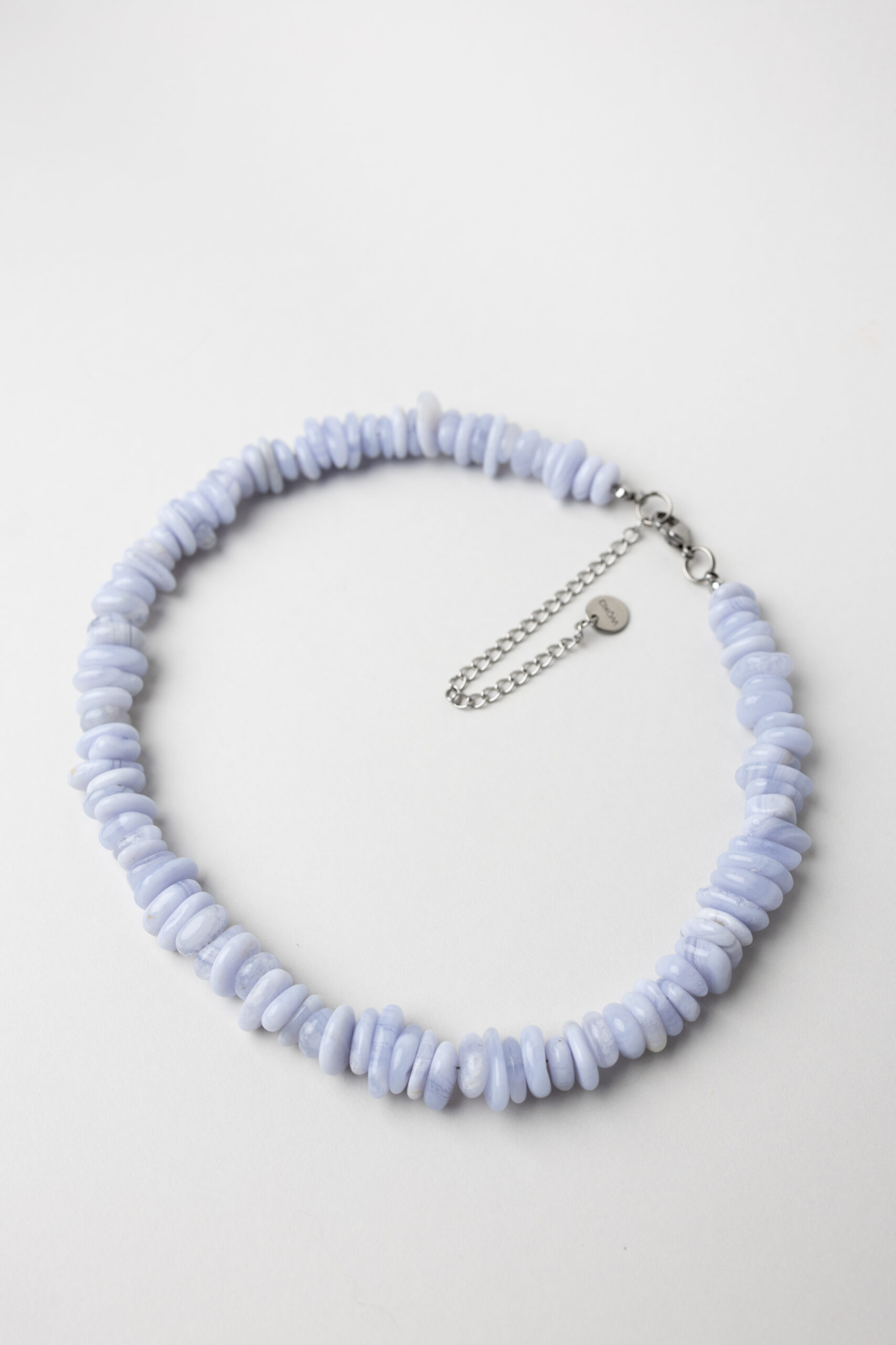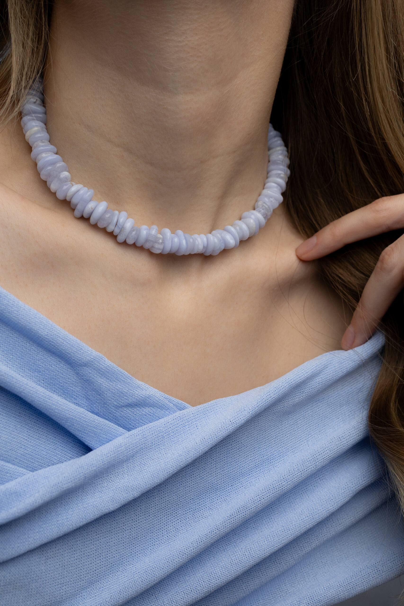 Delikatny naszyjnik z błękitnego chalcedonu zachwyca swoją subtelną barwą i lekkością formy. Kamień ten kojarzony jest ze spokojem, harmonią i wewnętrzną równowagą, dzięki czemu biżuteria ma nie tylko estetyczny, ale także symboliczny charakter.
