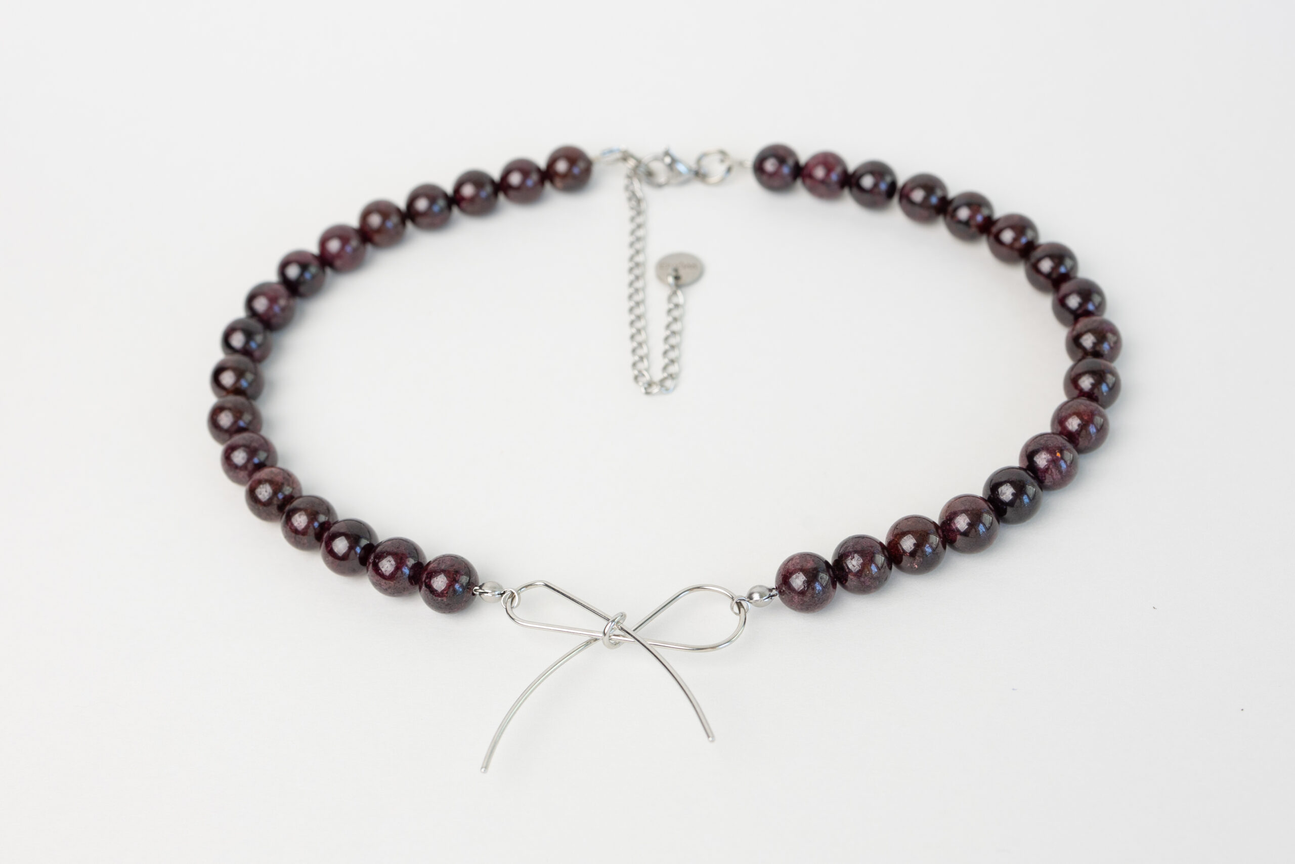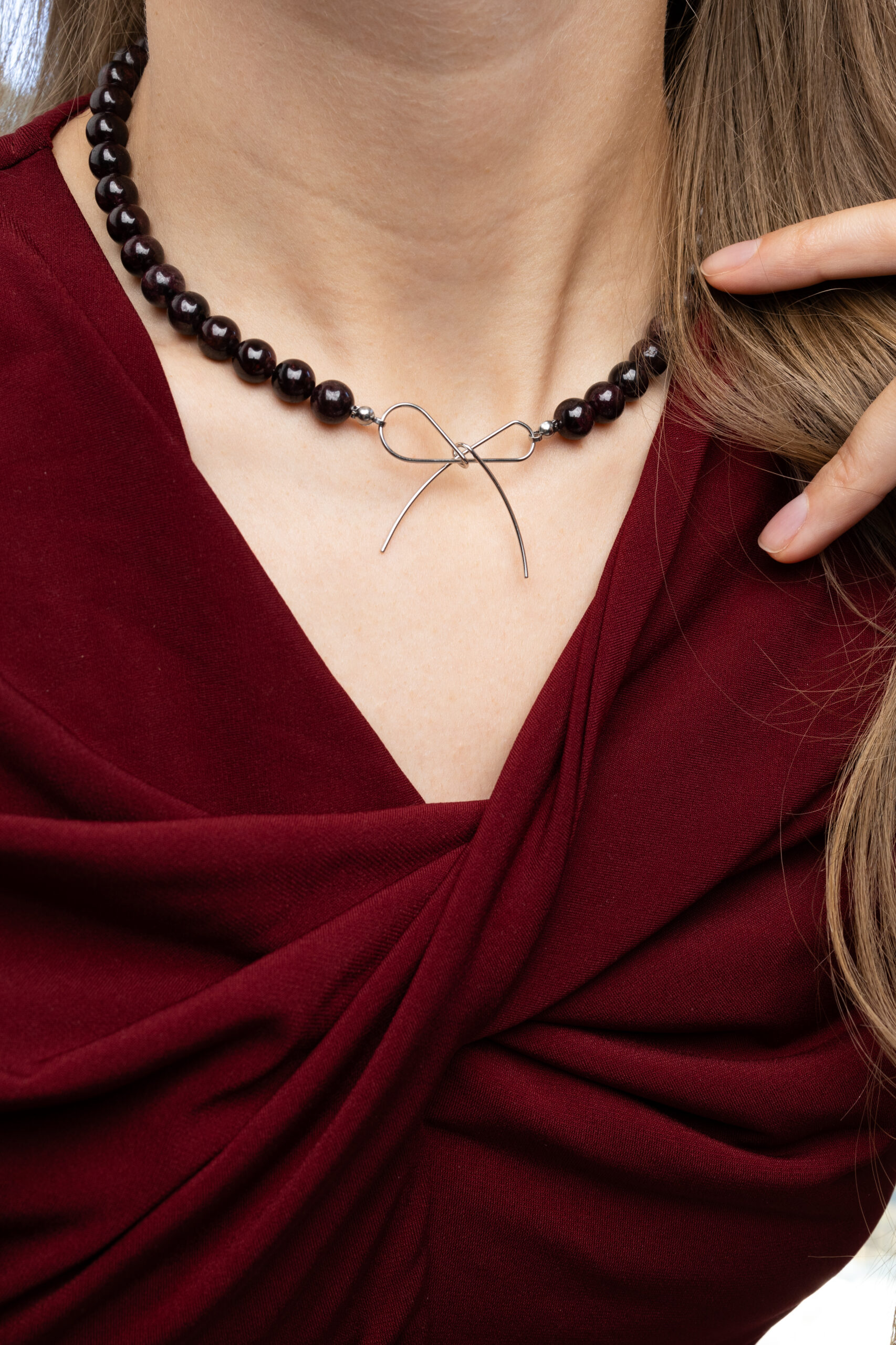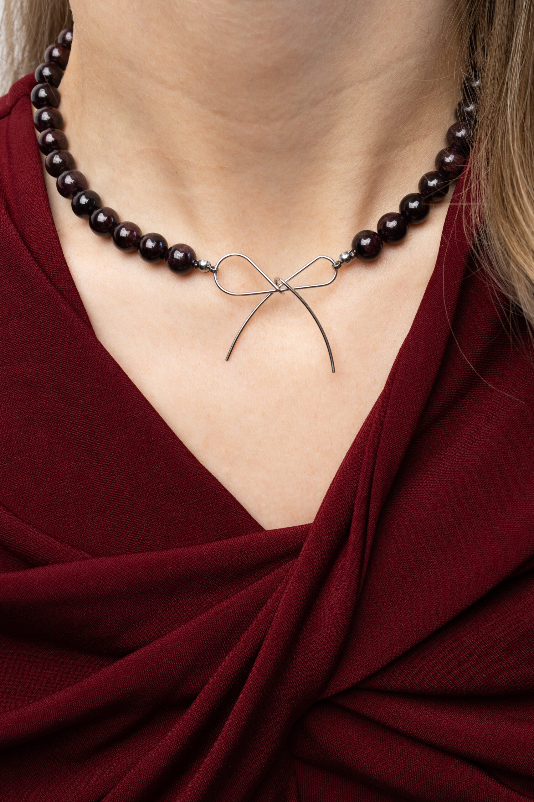 Wyjątkowy naszyjnik wykonany z ciemnoczerwonych granatów, ozdobiony w centrum delikatną stalową kokardką. Intensywny kolor kamieni w połączeniu z minimalistycznym blaskiem stali tworzy elegancki i nowoczesny efekt. Lekki, a jednocześnie przyciągający wzrok, idealny do codziennych stylizacji oraz na wyjątkowe okazje, dodając subtelnego uroku każdemu lookowi