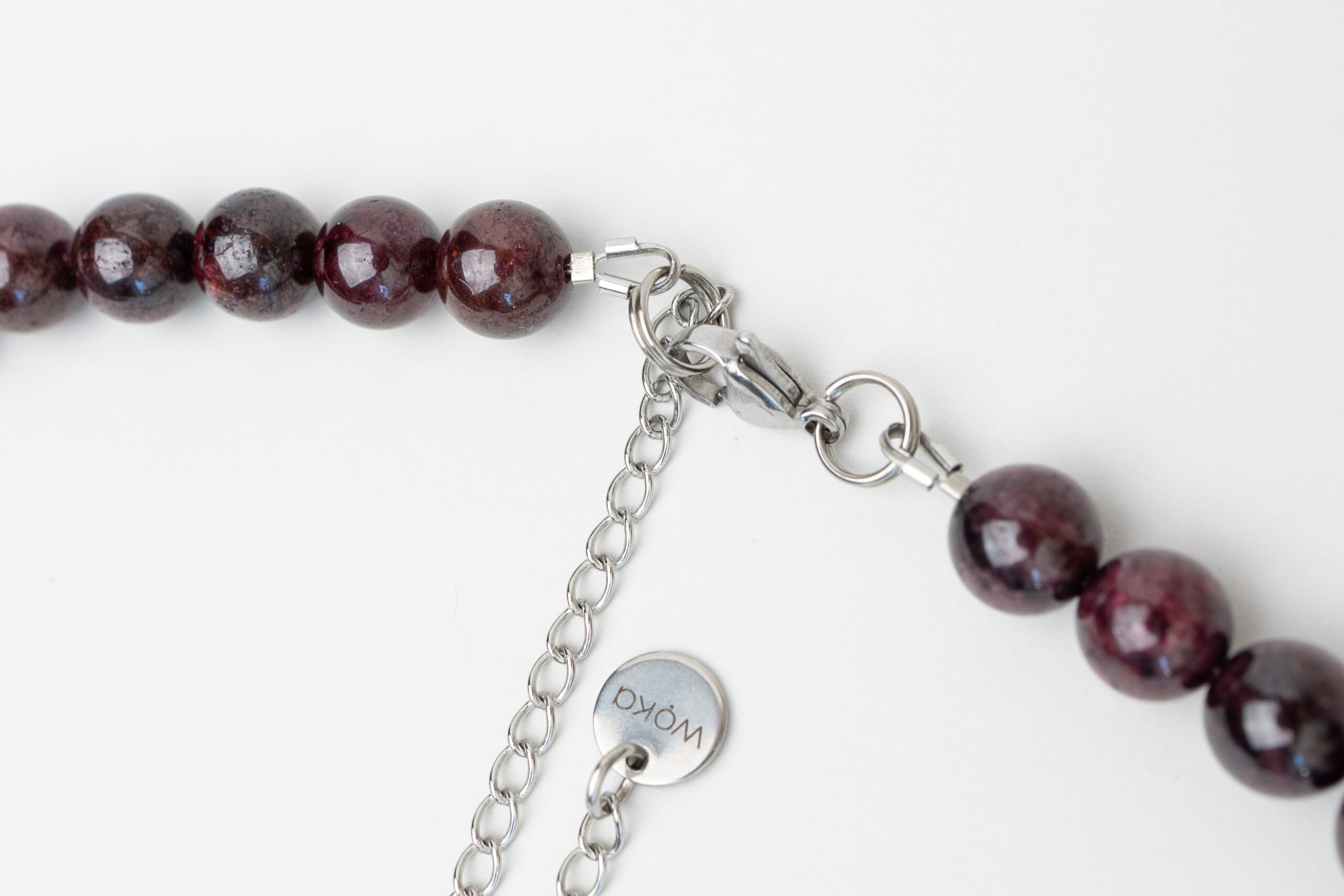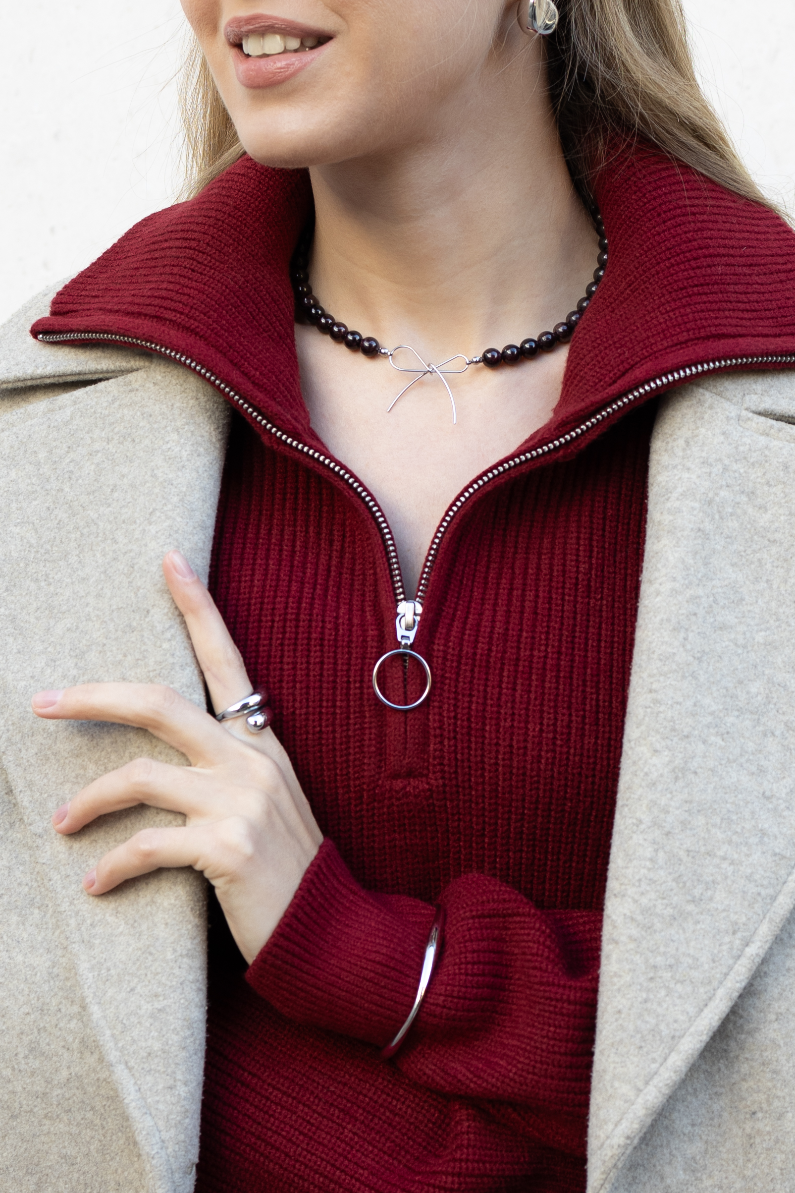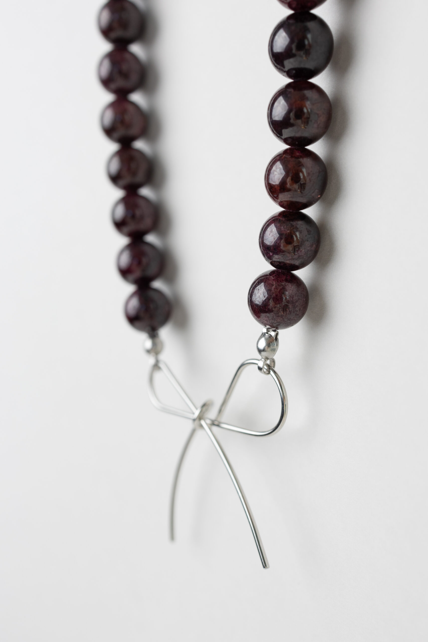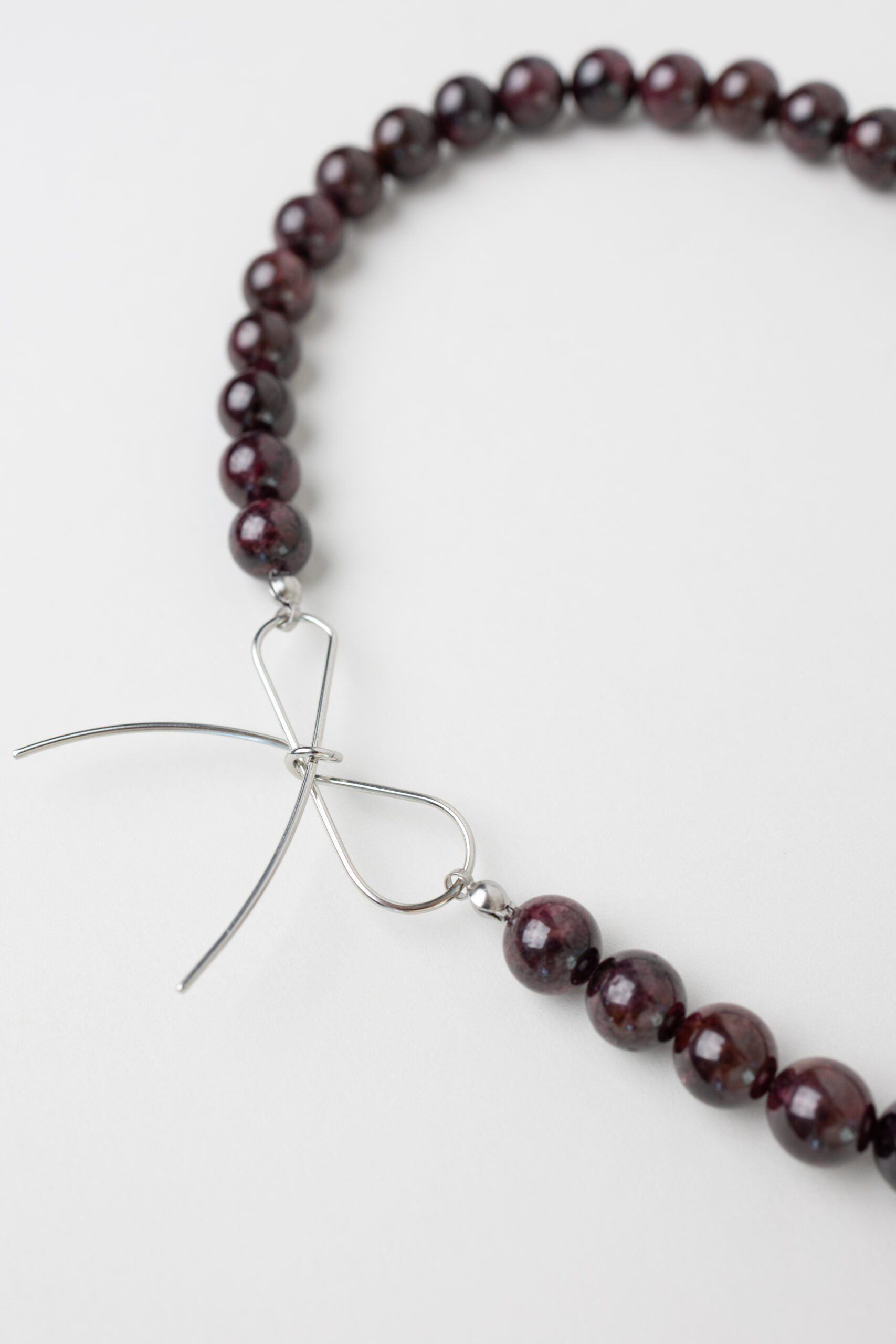 Wyjątkowy naszyjnik wykonany z ciemnoczerwonych granatów, ozdobiony w centrum delikatną stalową kokardką. Intensywny kolor kamieni w połączeniu z minimalistycznym blaskiem stali tworzy elegancki i nowoczesny efekt. Lekki, a jednocześnie przyciągający wzrok, idealny do codziennych stylizacji oraz na wyjątkowe okazje, dodając subtelnego uroku każdemu lookowi