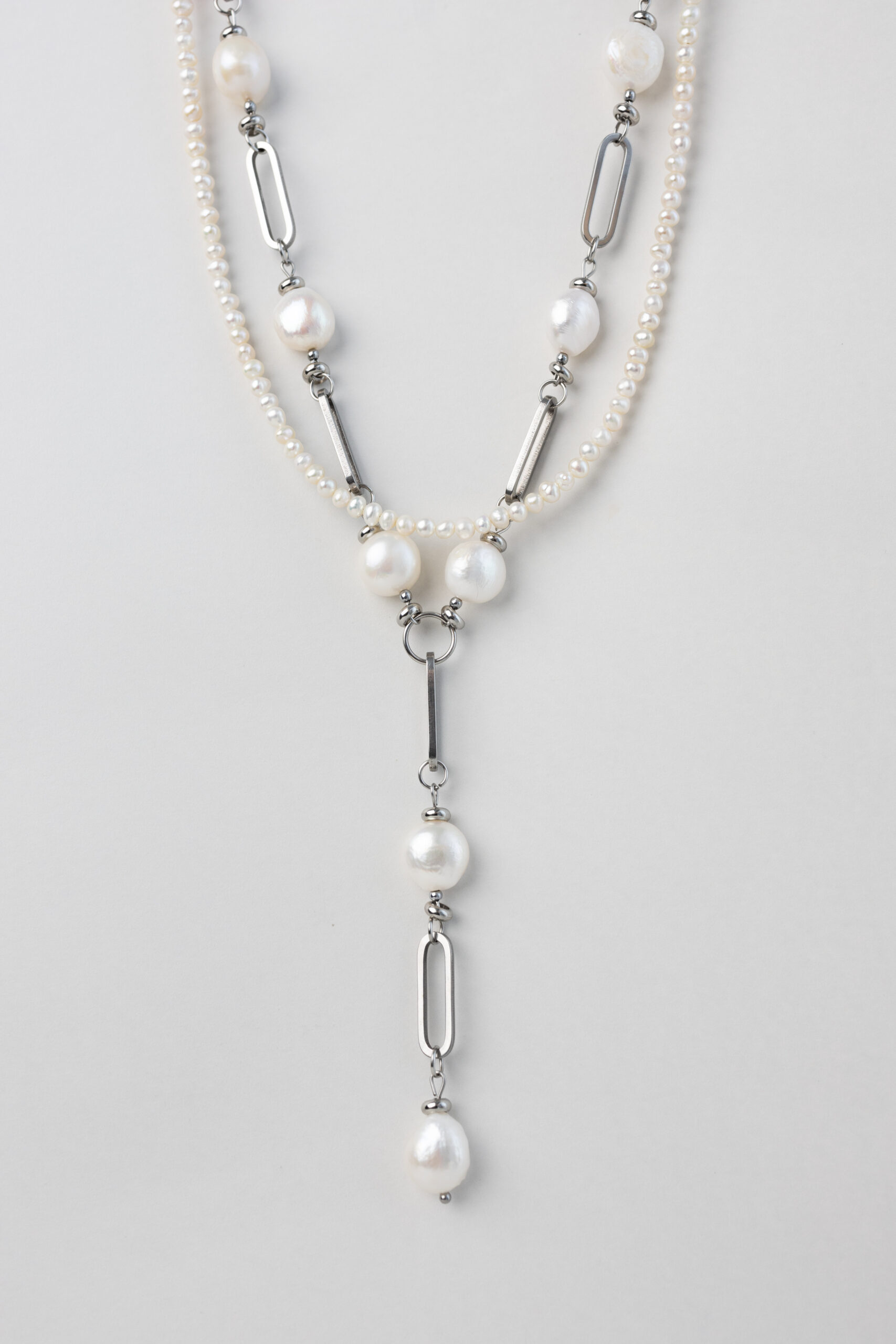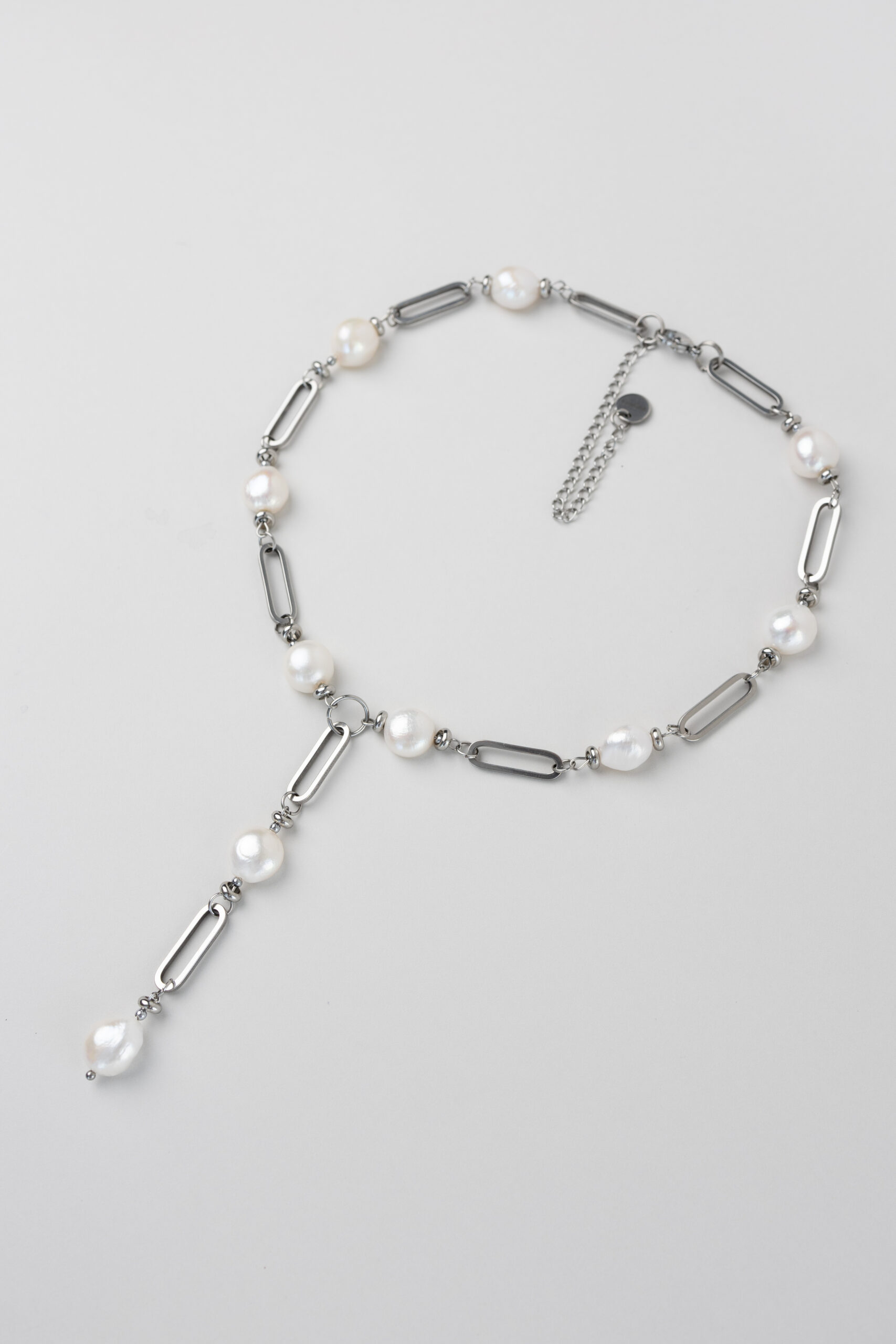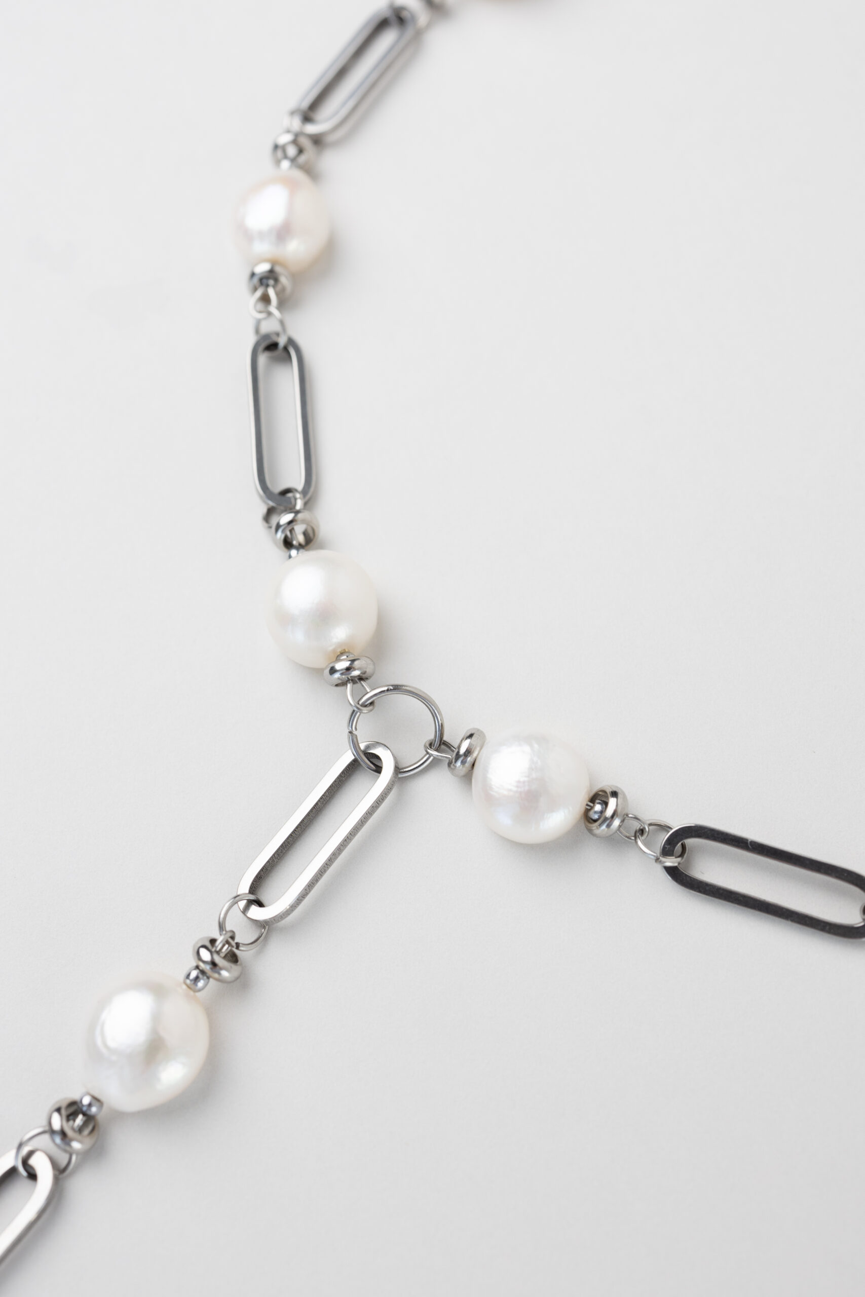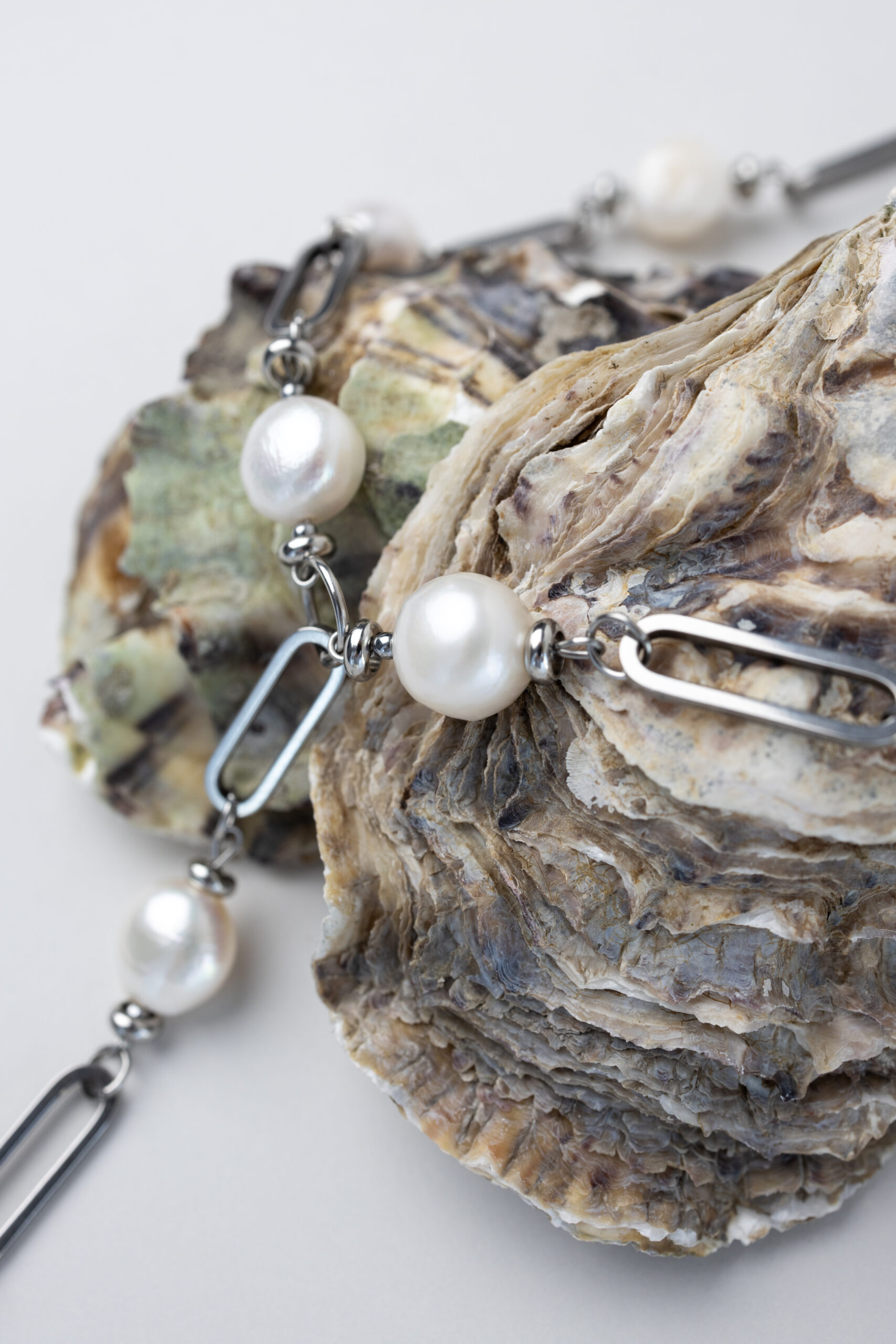 Naszyjnik z dużych pereł z metalicznymi owalami to wyrazisty i stylowy akcent, który przyciąga uwagę. Kontrast naturalnych pereł i chłodnego blasku metalu tworzy nowoczesną, zrównoważoną formę.