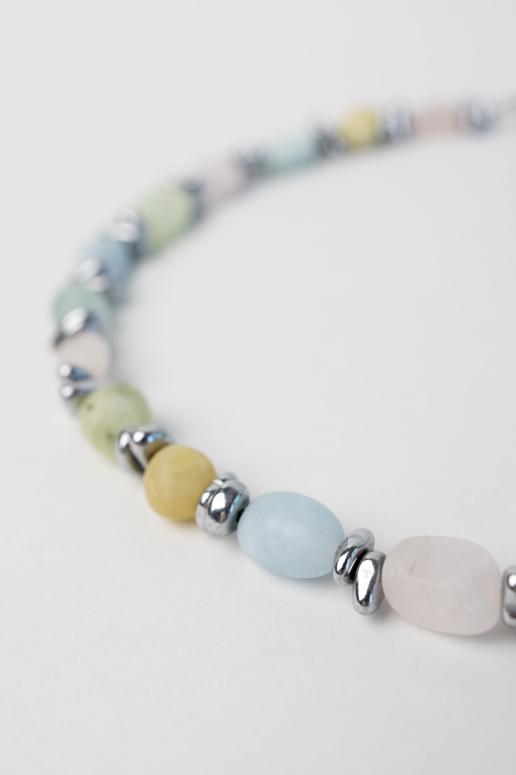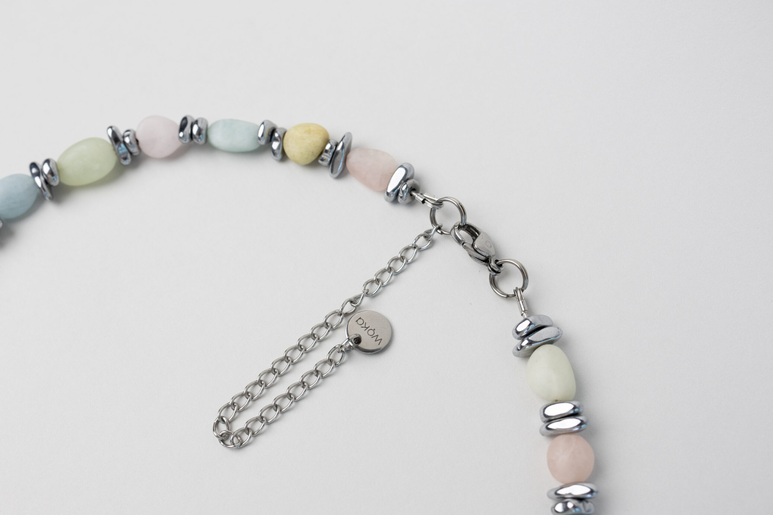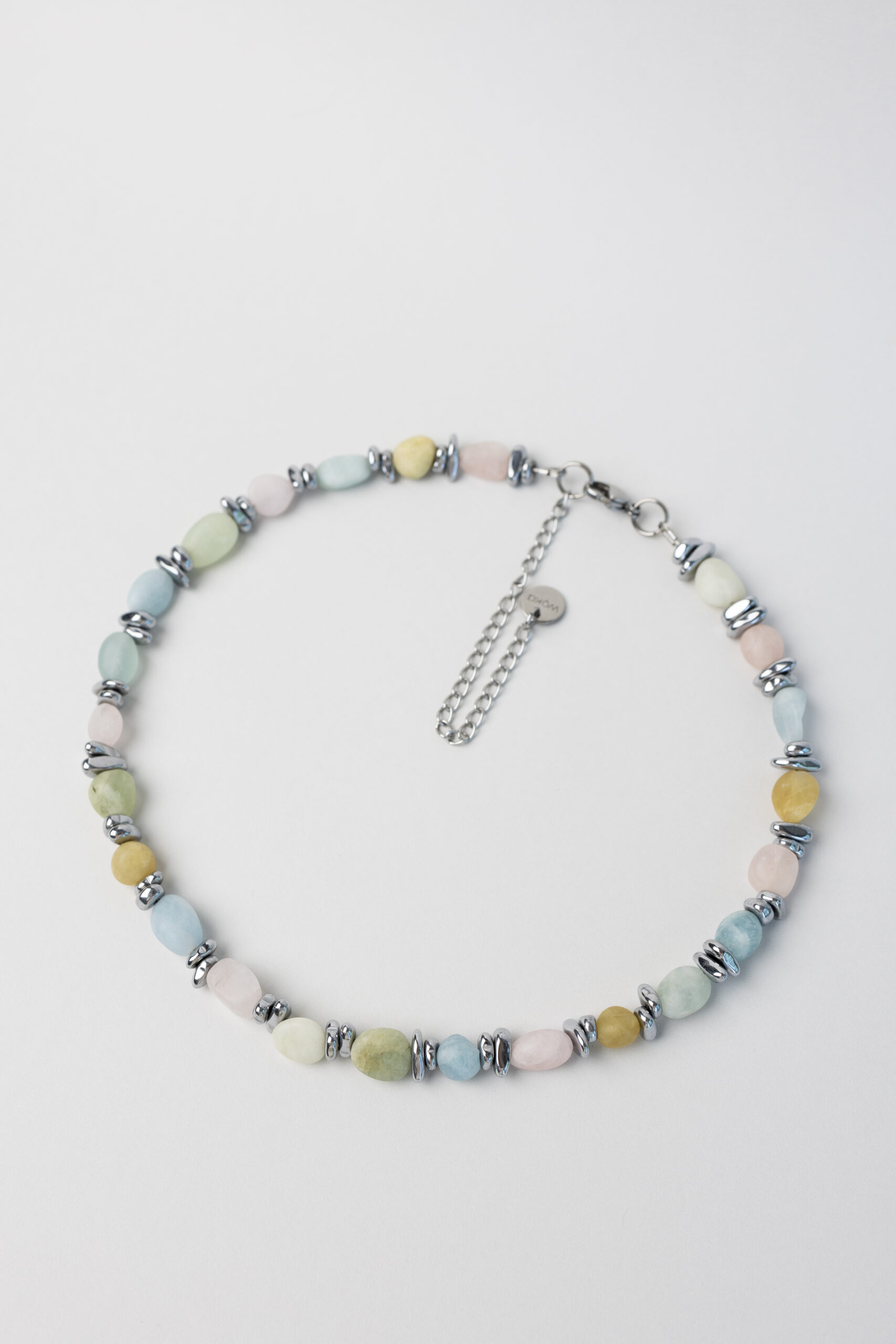 Delikatny, kolorowy naszyjnik wykonany z różnorodnych koralików morganitu w pastelowych odcieniach. Uniwersalny i lekki, pozwala dopasować biżuterię do różnych kolorów ubrań lub dodać subtelnego koloru do jednolitej stylizacji, tworząc świeży i radosny akcent