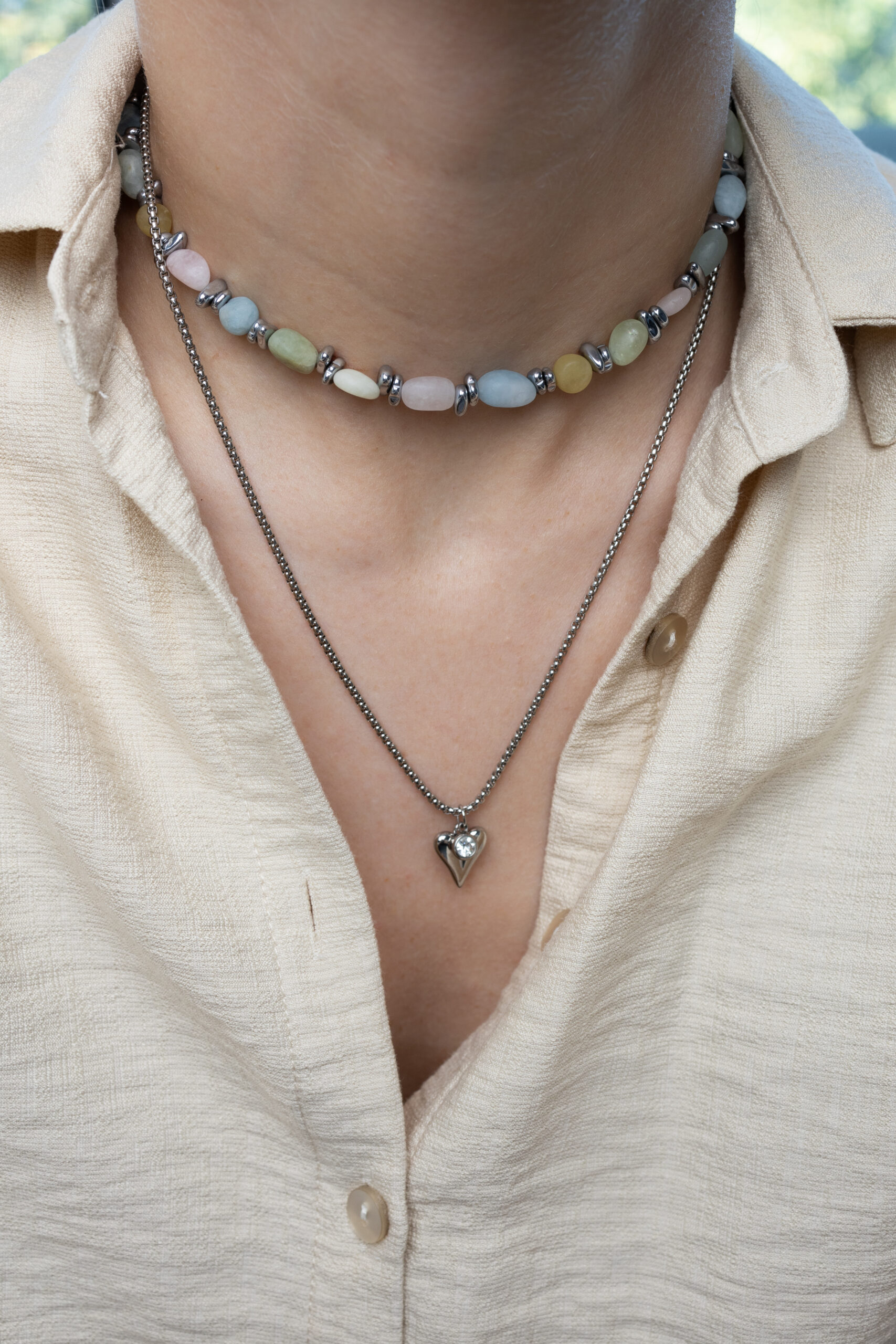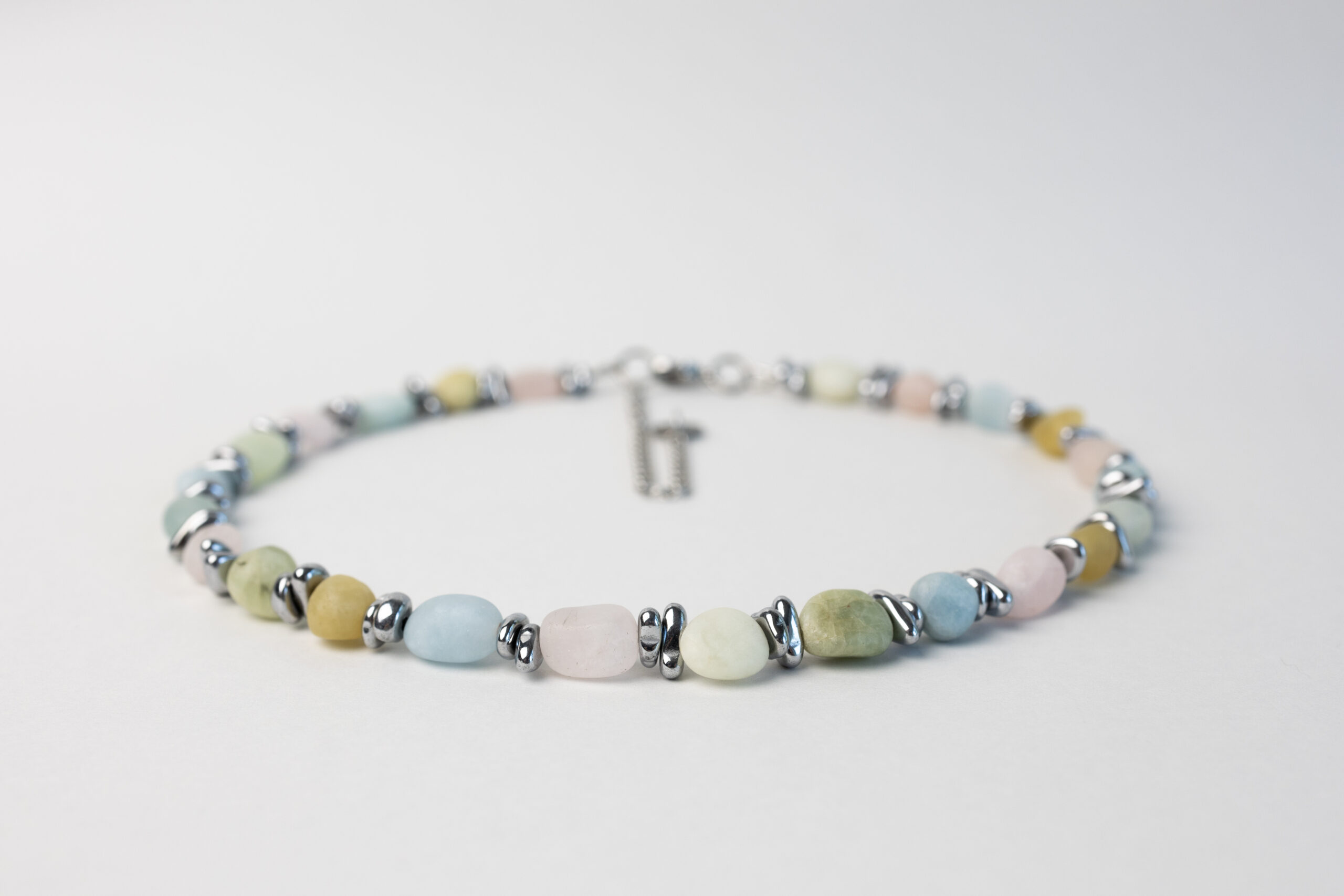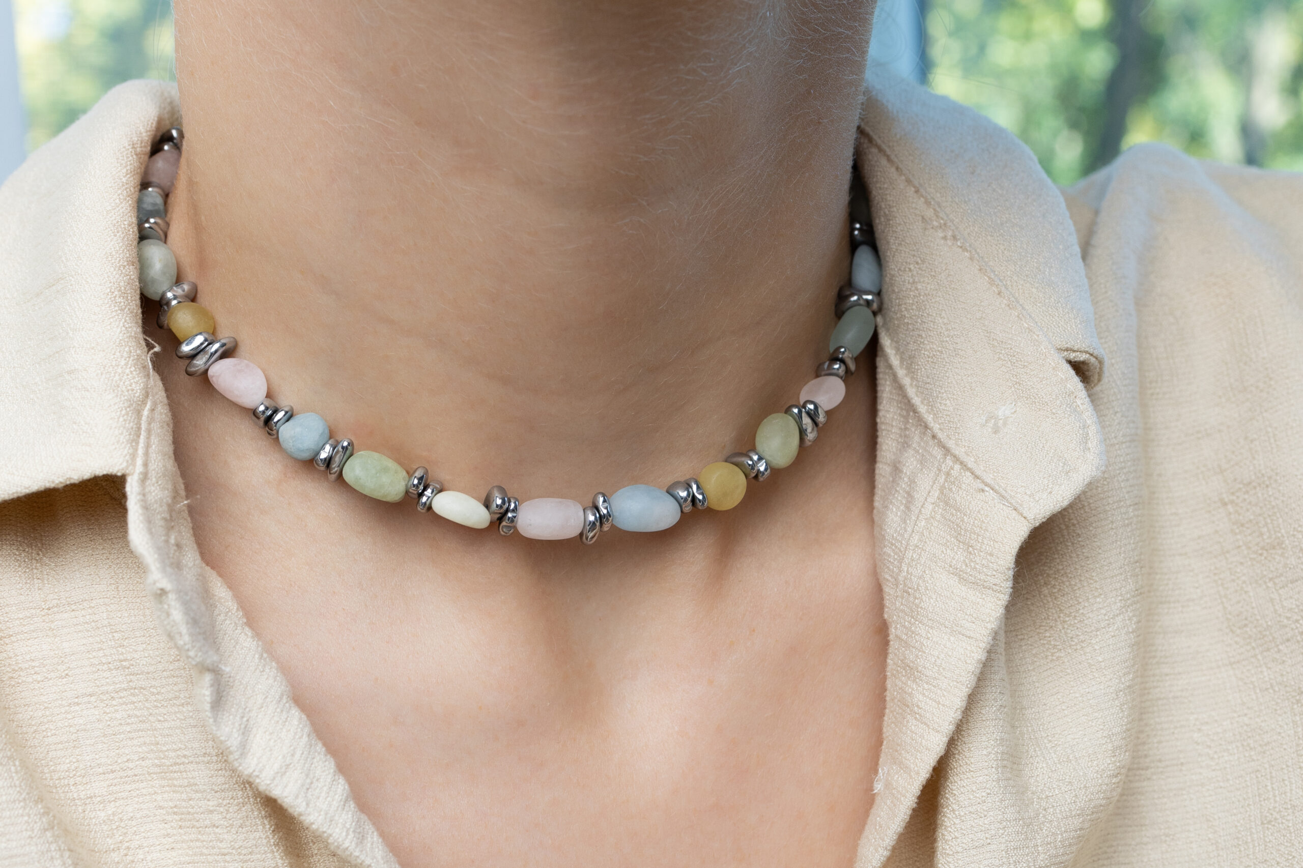 Delikatny, kolorowy naszyjnik wykonany z różnorodnych koralików morganitu w pastelowych odcieniach. Uniwersalny i lekki, pozwala dopasować biżuterię do różnych kolorów ubrań lub dodać subtelnego koloru do jednolitej stylizacji, tworząc świeży i radosny akcent