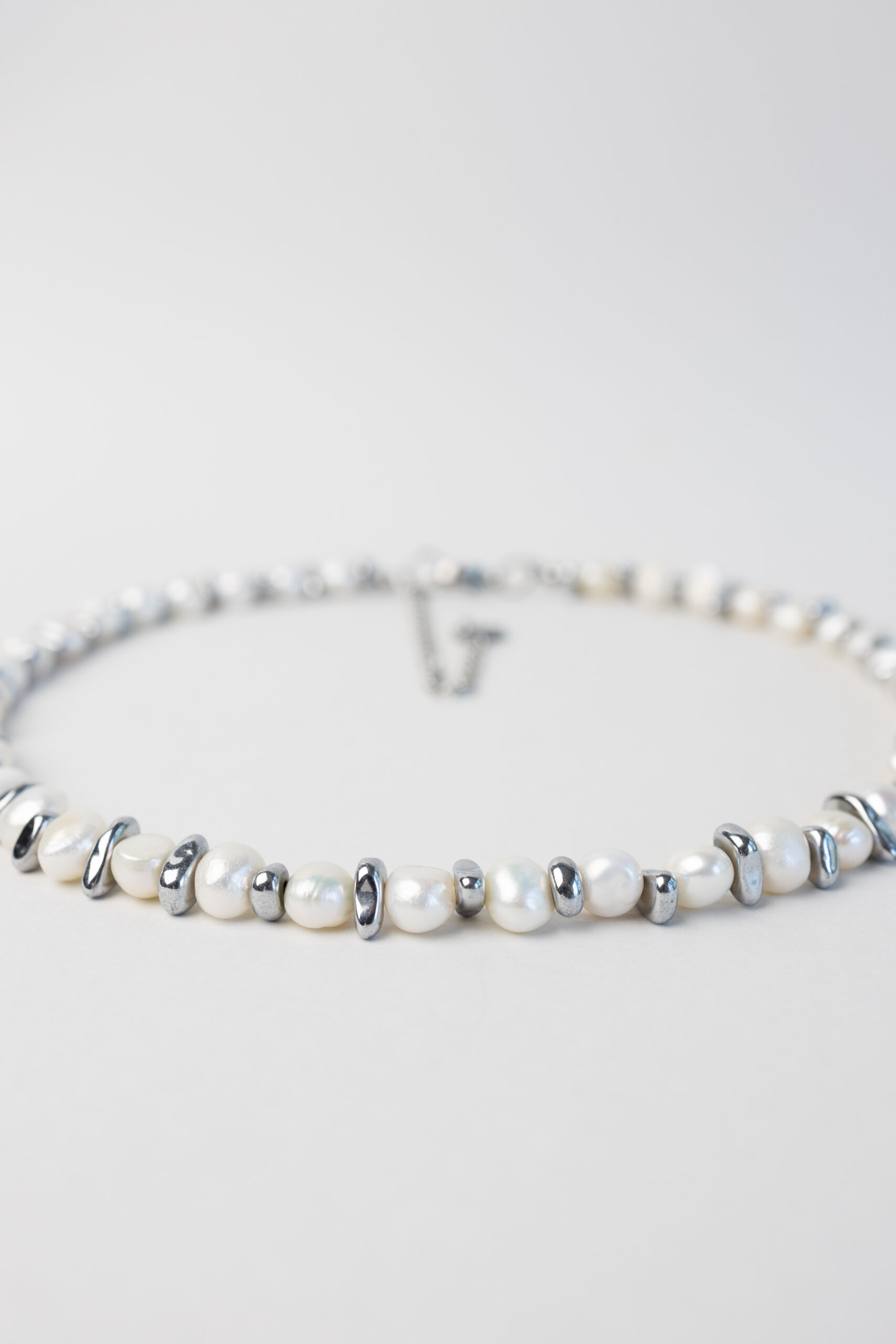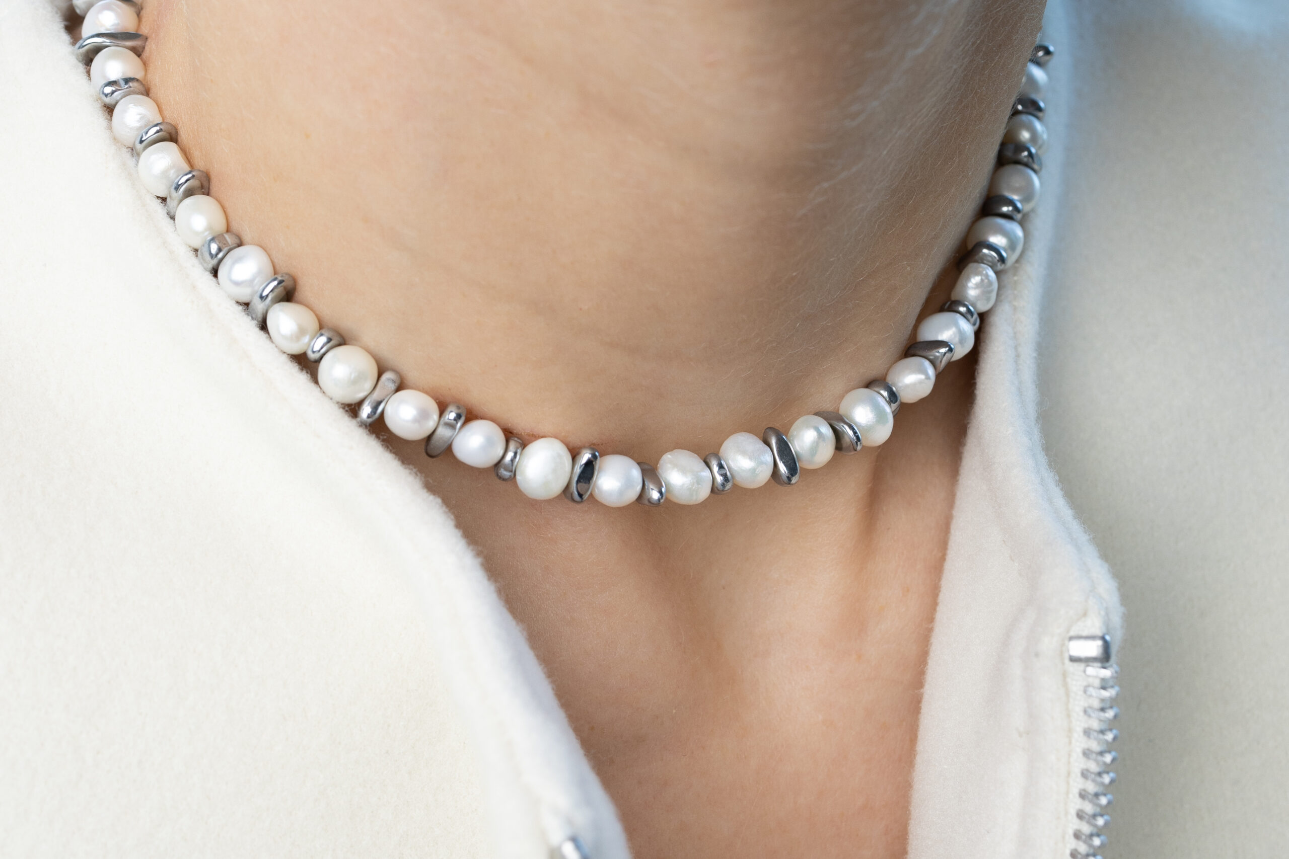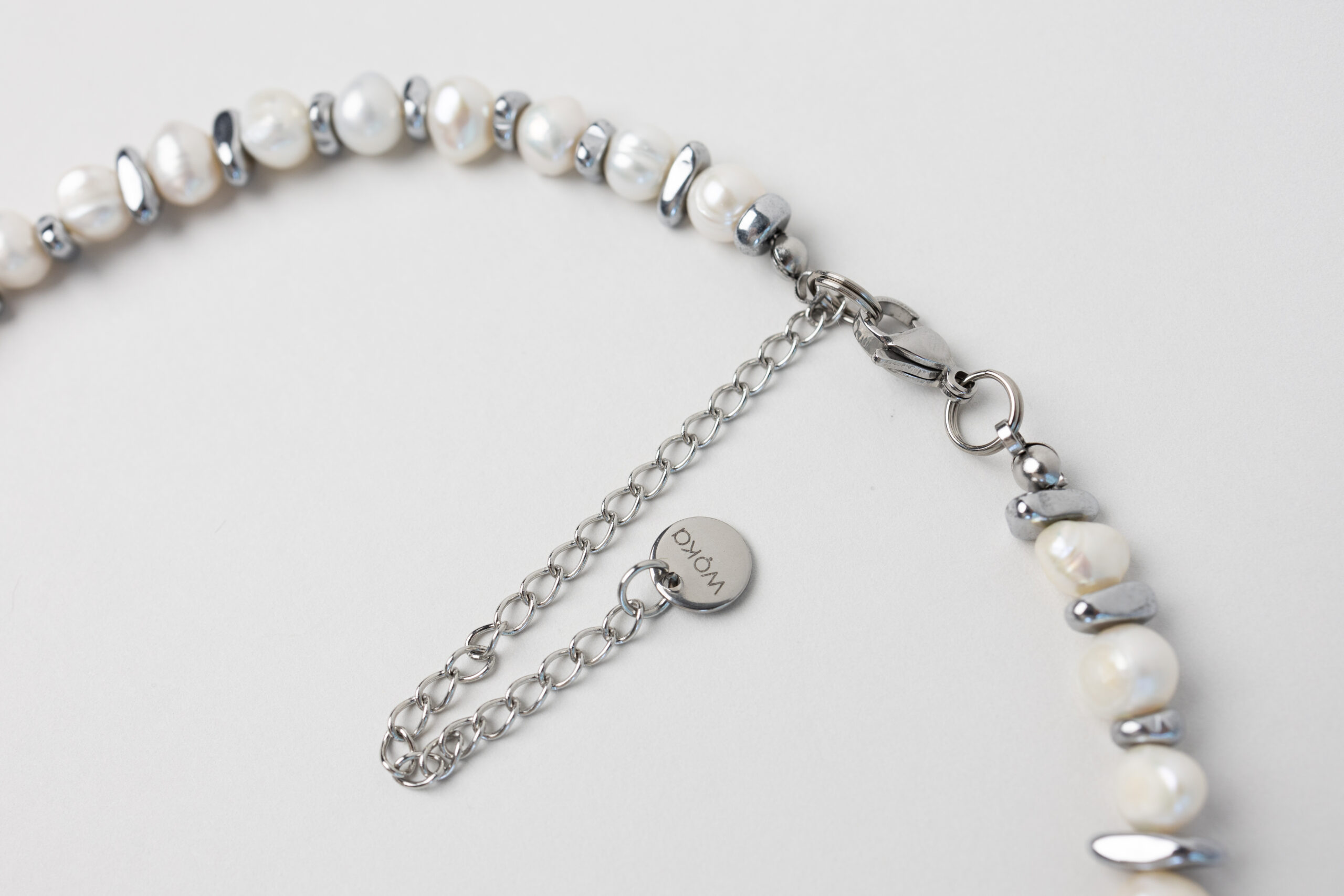 Wyjątkowy naszyjnik wykonany z lśniących pereł barokowych w połączeniu z nieregularnymi kamieniami hematytu. Barokowy perłowy akcent pozostaje modny i ponadczasowy każdego roku, a nieregularne kształty kamieni pozwalają na codzienne noszenie. Kontrast między miękkim połyskiem pereł a surowym, metalicznym charakterem hematytu tworzy nowoczesną i subtelną kompozycję, która podkreśla indywidualny styl każdej osoby