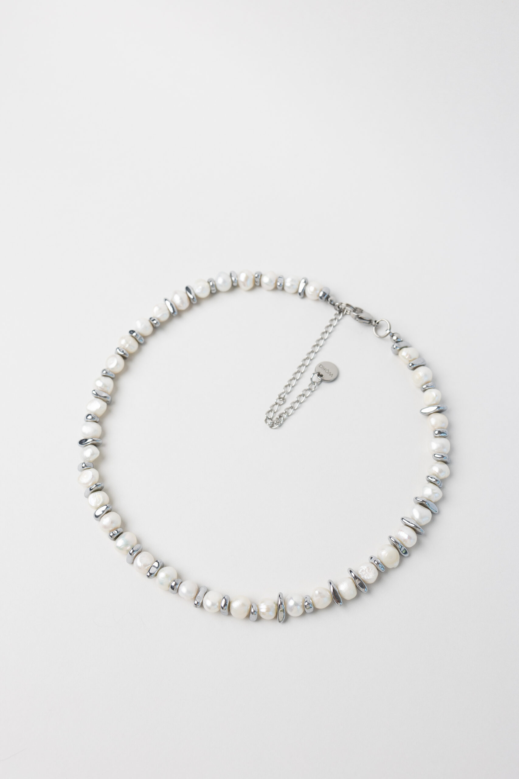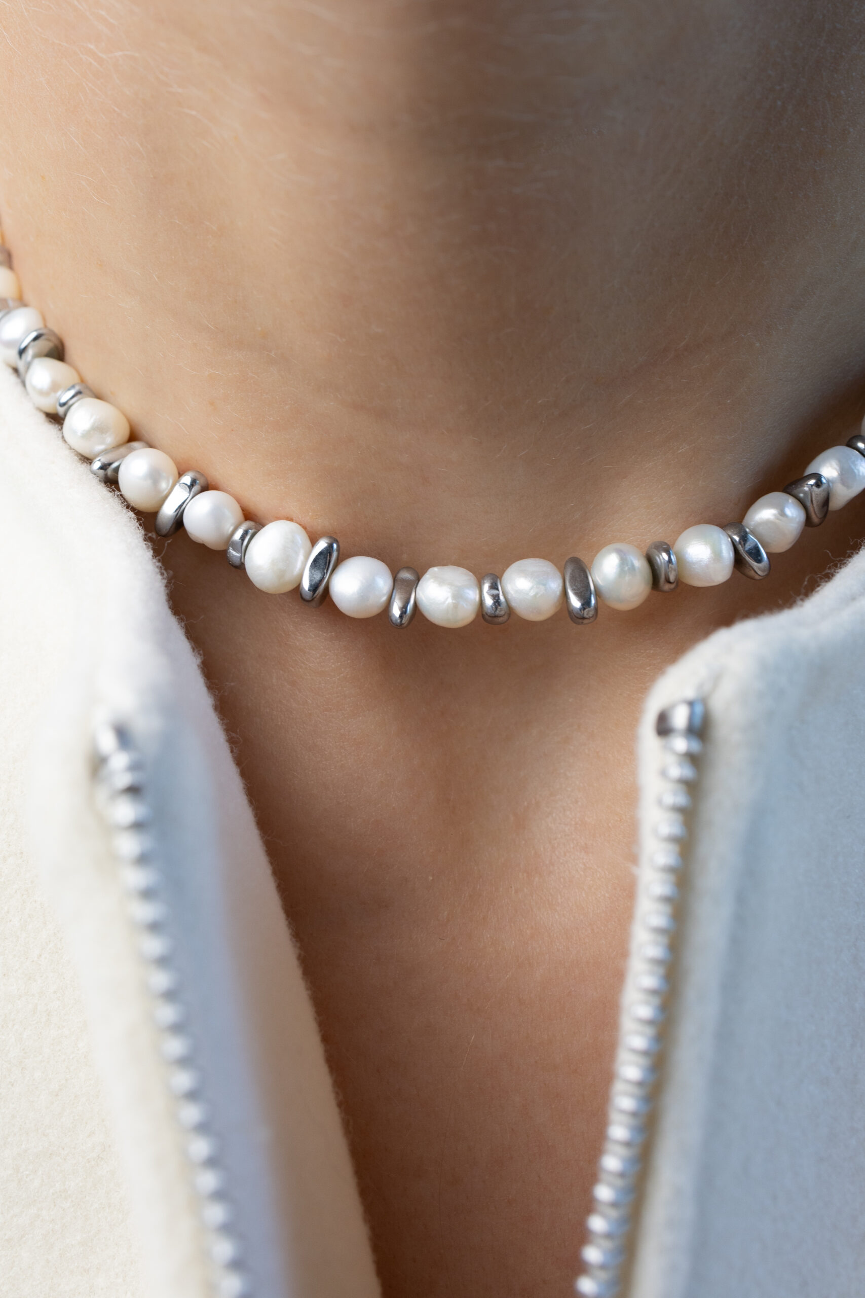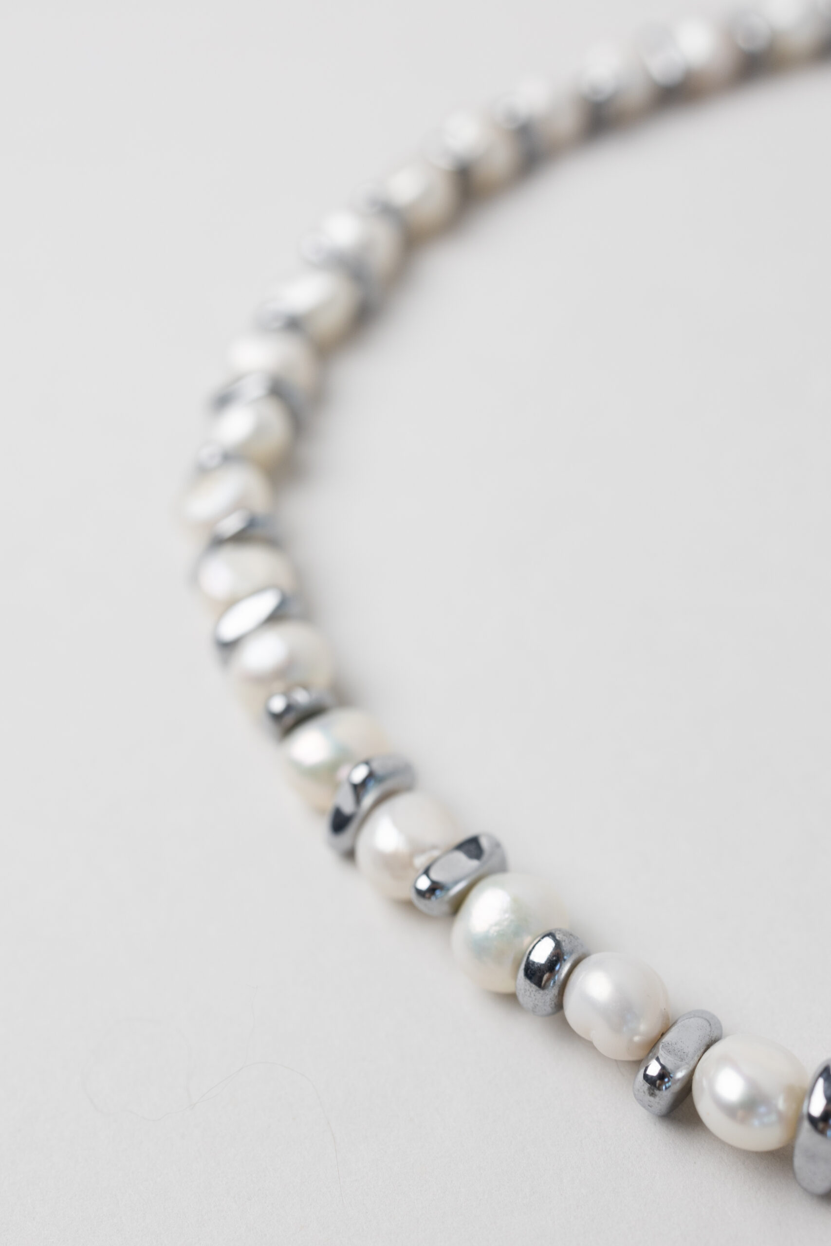 Wyjątkowy naszyjnik wykonany z lśniących pereł barokowych w połączeniu z nieregularnymi kamieniami hematytu. Barokowy perłowy akcent pozostaje modny i ponadczasowy każdego roku, a nieregularne kształty kamieni pozwalają na codzienne noszenie. Kontrast między miękkim połyskiem pereł a surowym, metalicznym charakterem hematytu tworzy nowoczesną i subtelną kompozycję, która podkreśla indywidualny styl każdej osoby