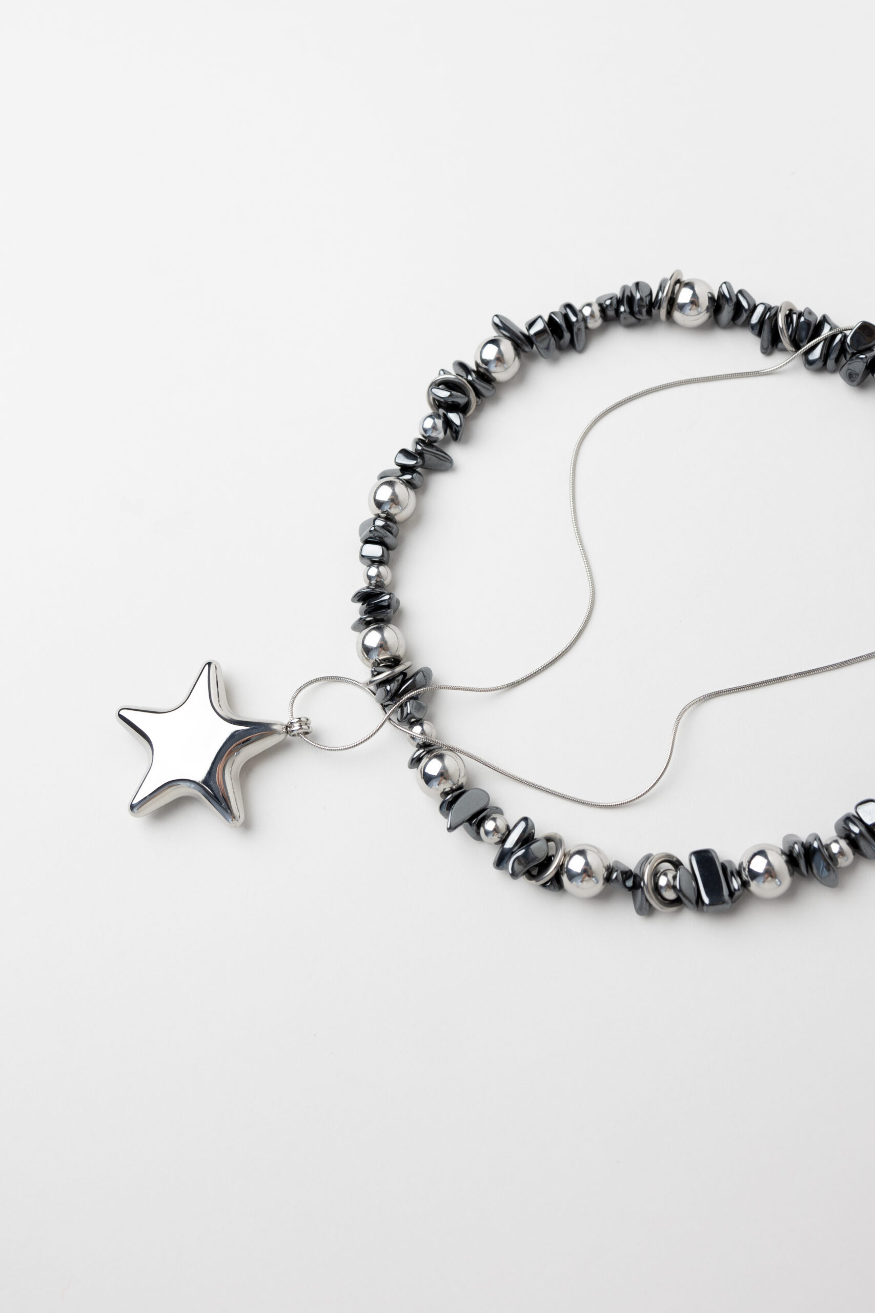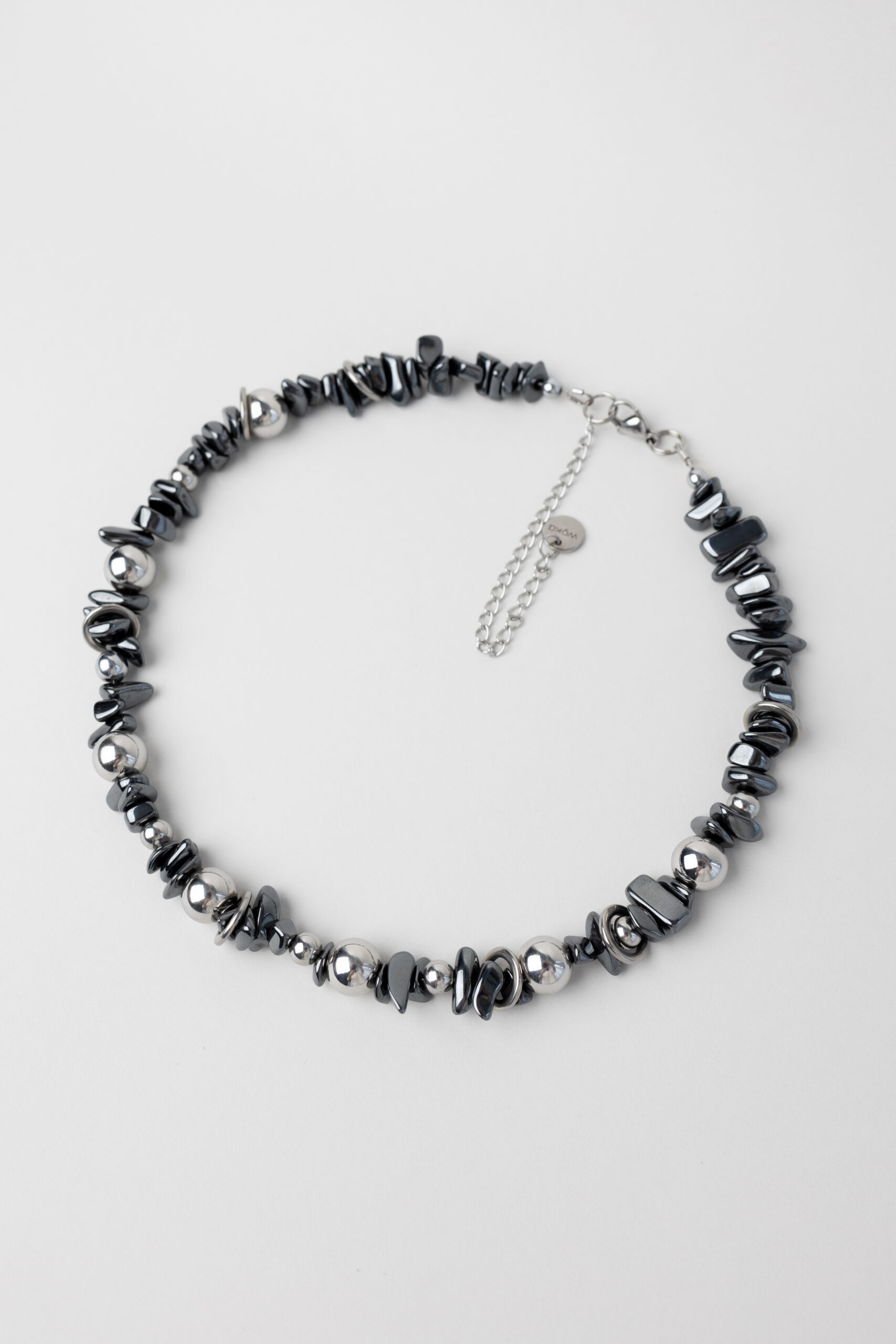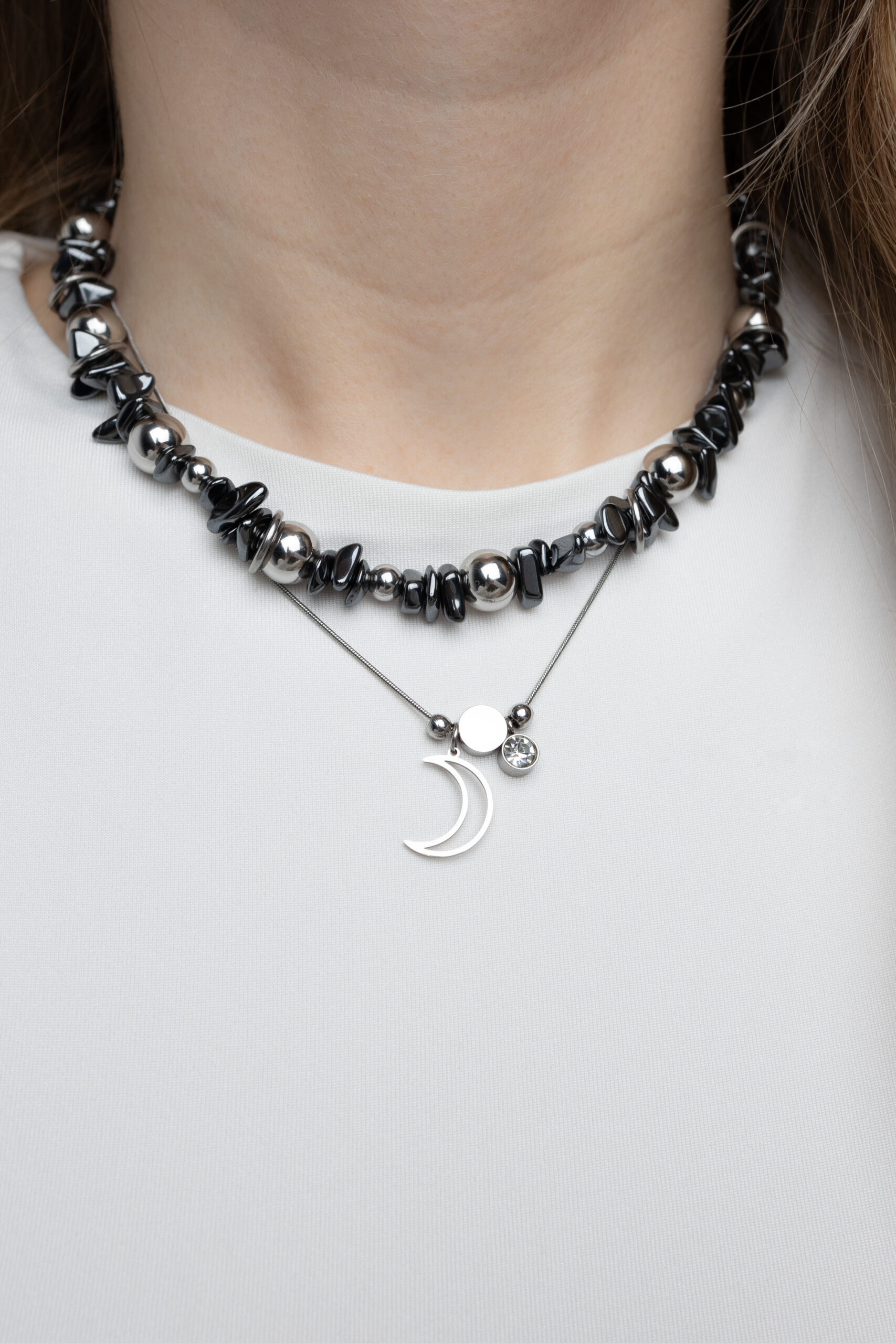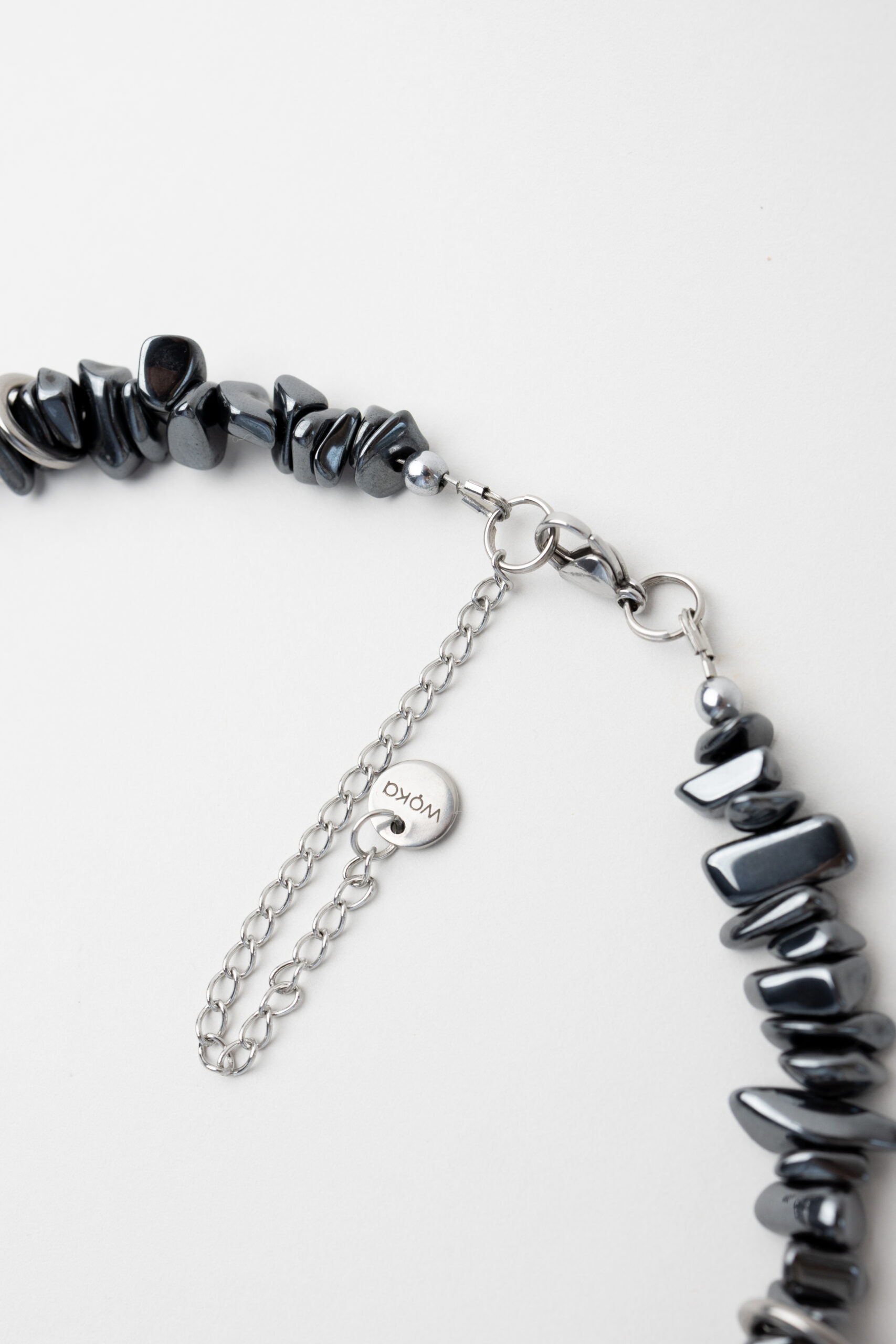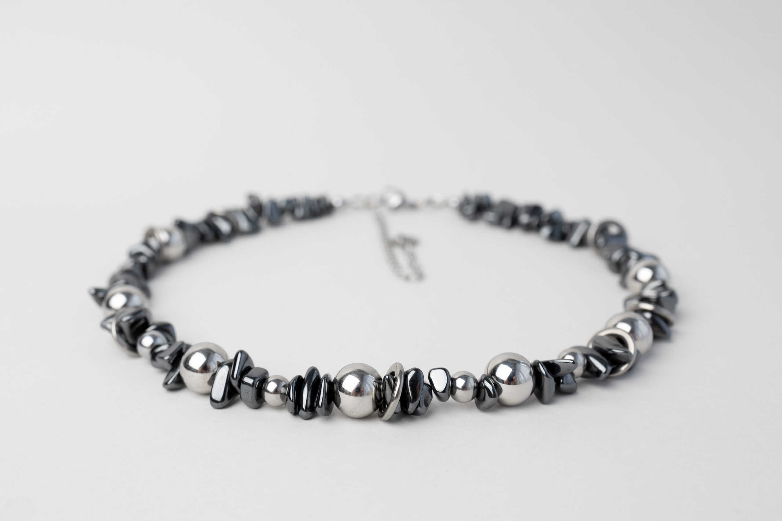 Naszyjnik Saturn to biżuteria inspirowana jedną z najbardziej hipnotyzujących planet Układu Słonecznego. Stalowe kółka układają się niczym orbitalne pierścienie, otaczając grafitowy hematyt oraz stalowe kule, które dodają kompozycji głębi i kosmicznego charakteru. Chłodny połysk stali kontrastuje z grafitowym odcieniem kamienia, tworząc nowoczesną i wyrazistą formę.
